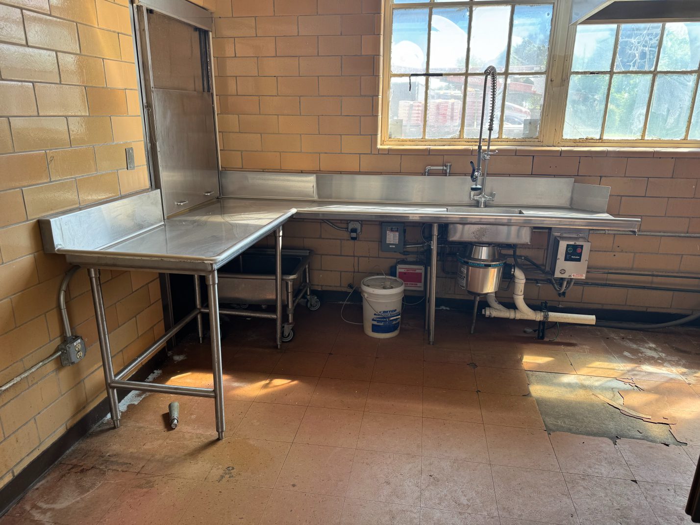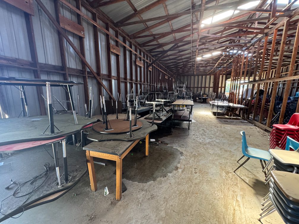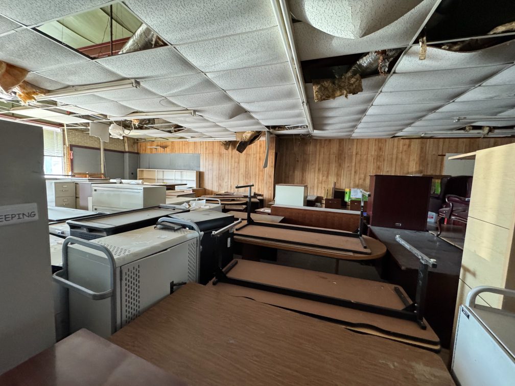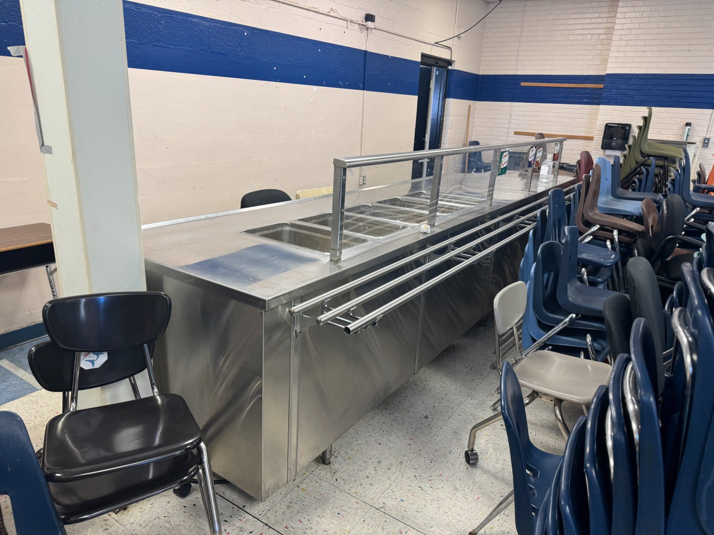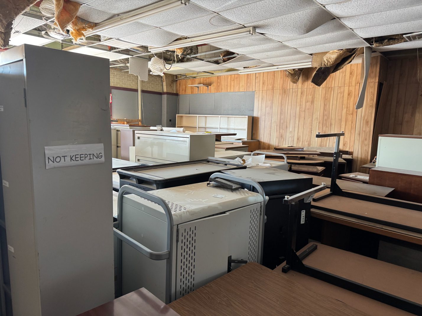 12′ Buffet Bar – True SS 2-Door Refrigerator – (2) USA Range 6-Burner Gas Stoves – 3-Vat SS Sink – SS Dishwashing Table w/Disposal – SS Table w/Pot Rack & Can Opener – SS Tables – Cafeteria Tables – Desks – Chairs – Metal Shelves – Electronics (Computers, Printers, Projectors) – Metal & Rubbermaid Cabinets – File Cabinets – Roll Around Shelves – Portable Stairs – Tables