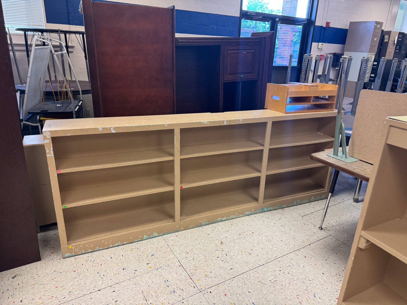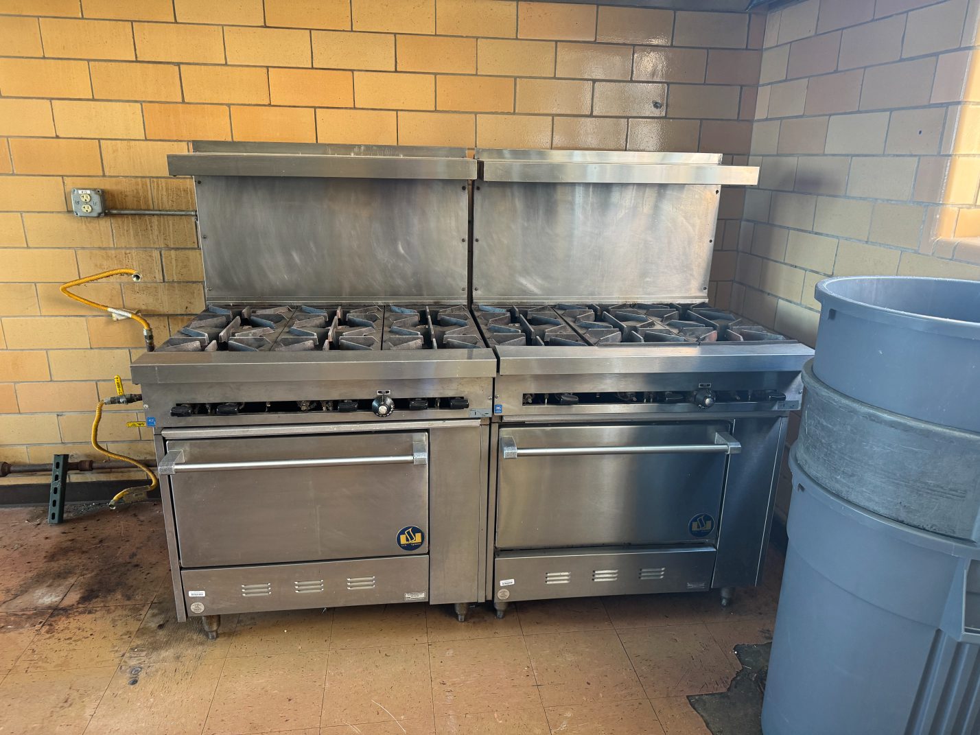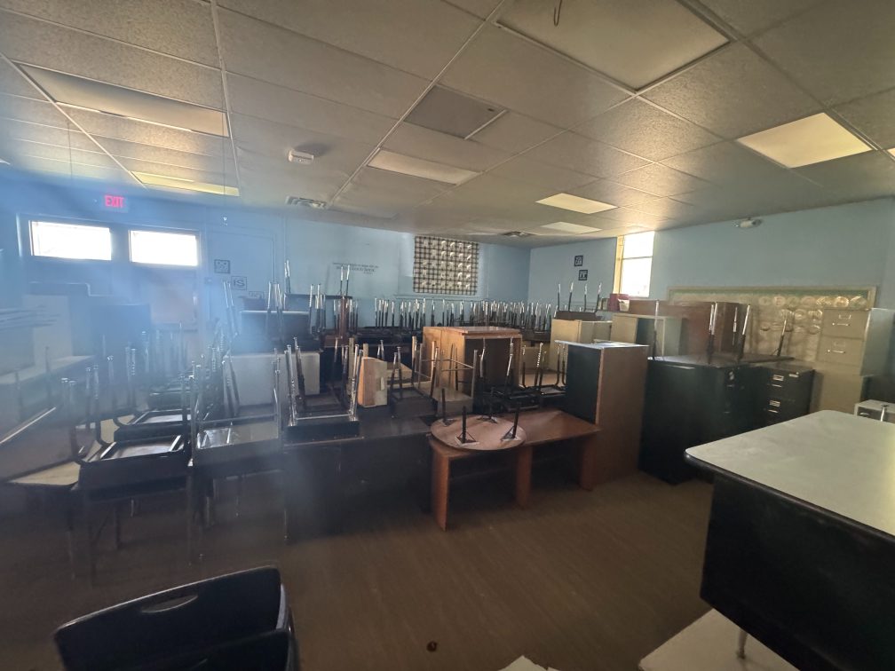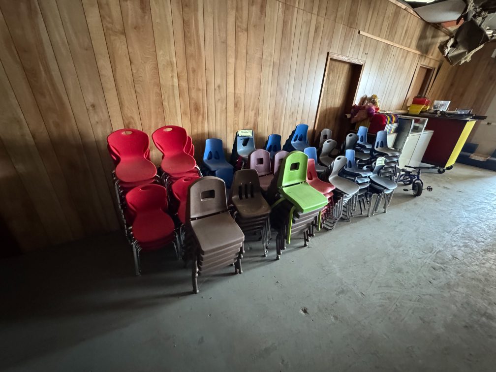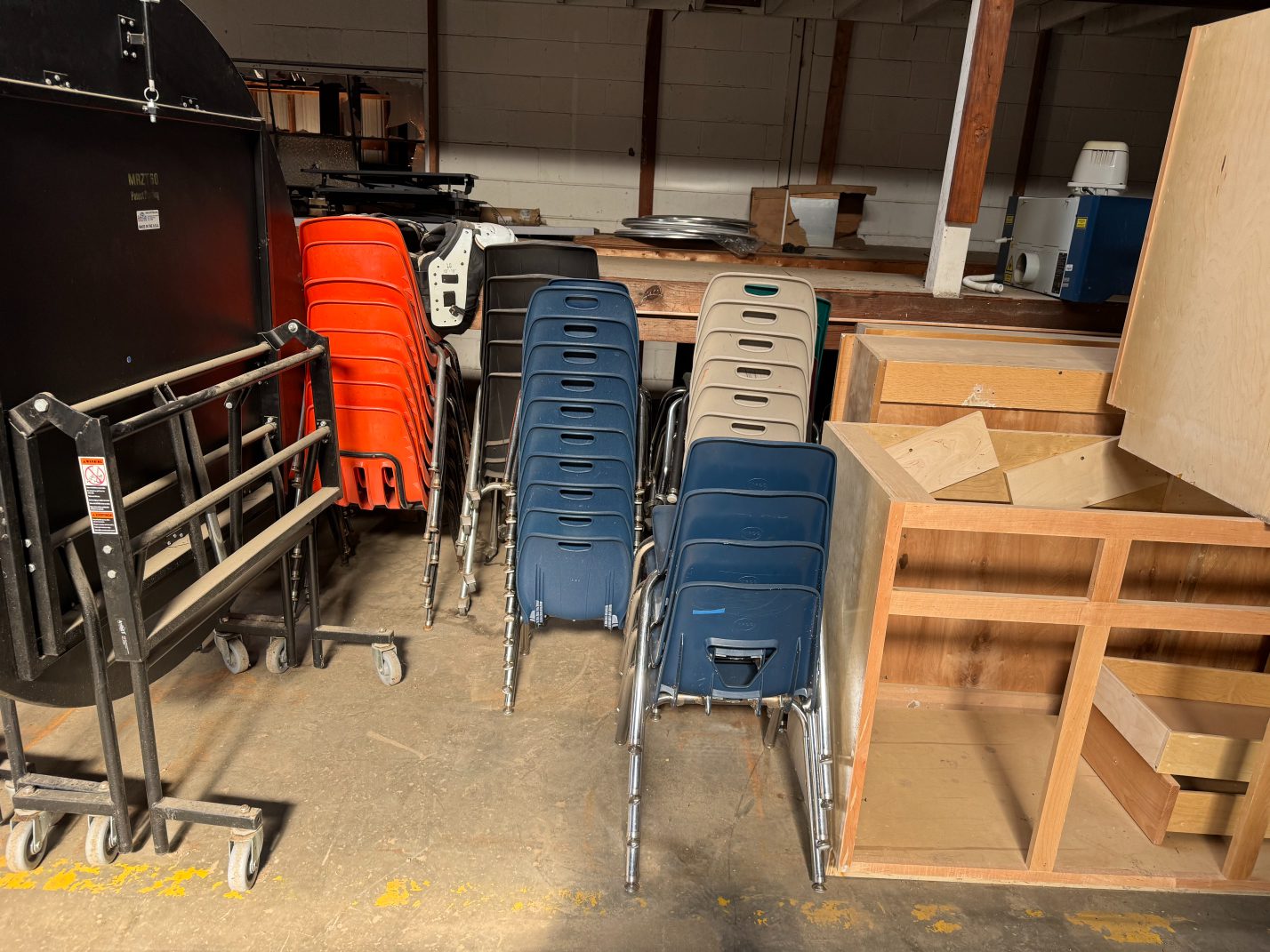 12′ Buffet Bar – True SS 2-Door Refrigerator – (2) USA Range 6-Burner Gas Stoves – 3-Vat SS Sink – SS Dishwashing Table w/Disposal – SS Table w/Pot Rack & Can Opener – SS Tables – Cafeteria Tables – Desks – Chairs – Metal Shelves – Electronics (Computers, Printers, Projectors) – Metal & Rubbermaid Cabinets – File Cabinets – Roll Around Shelves – Portable Stairs – Tables