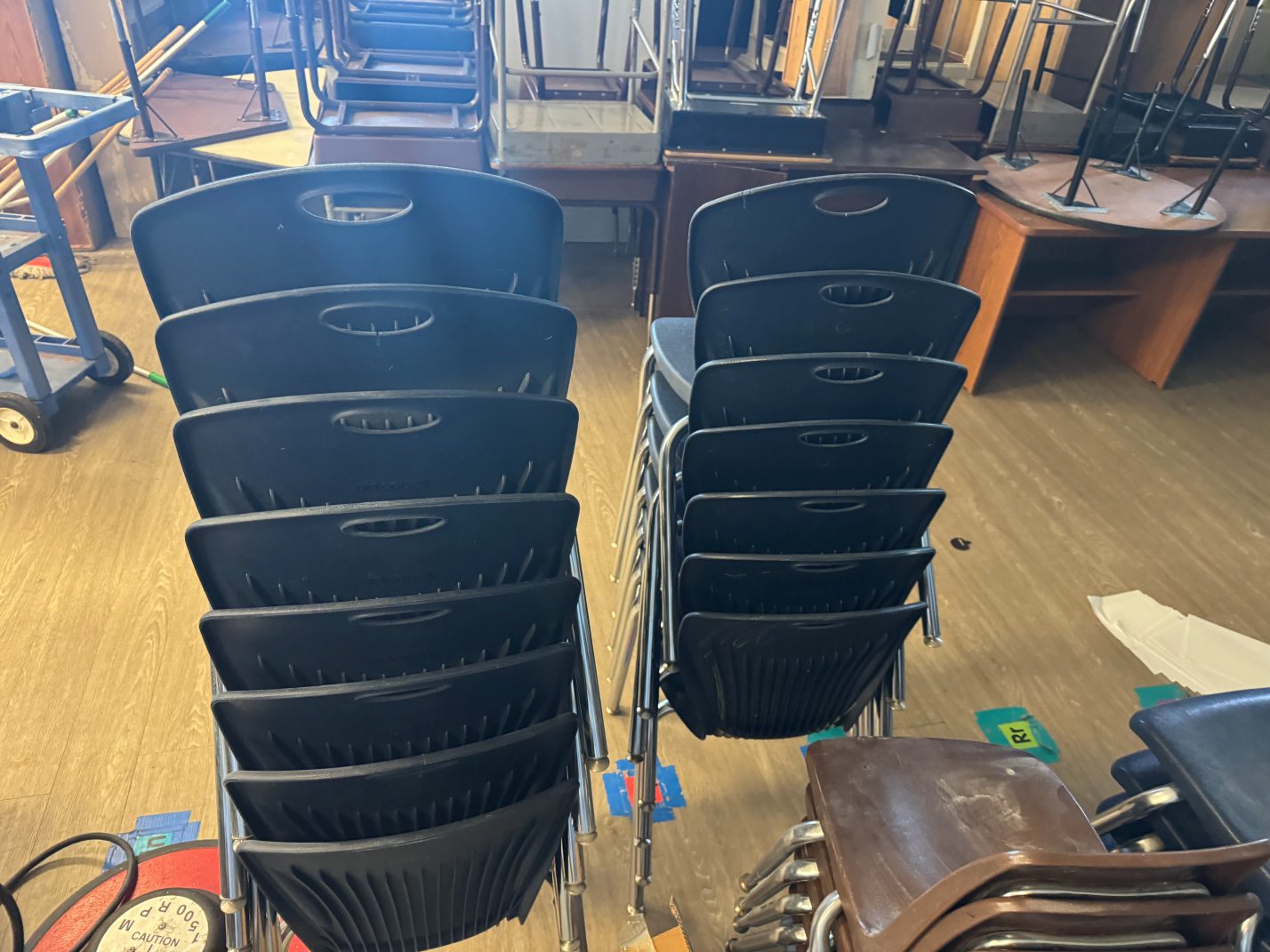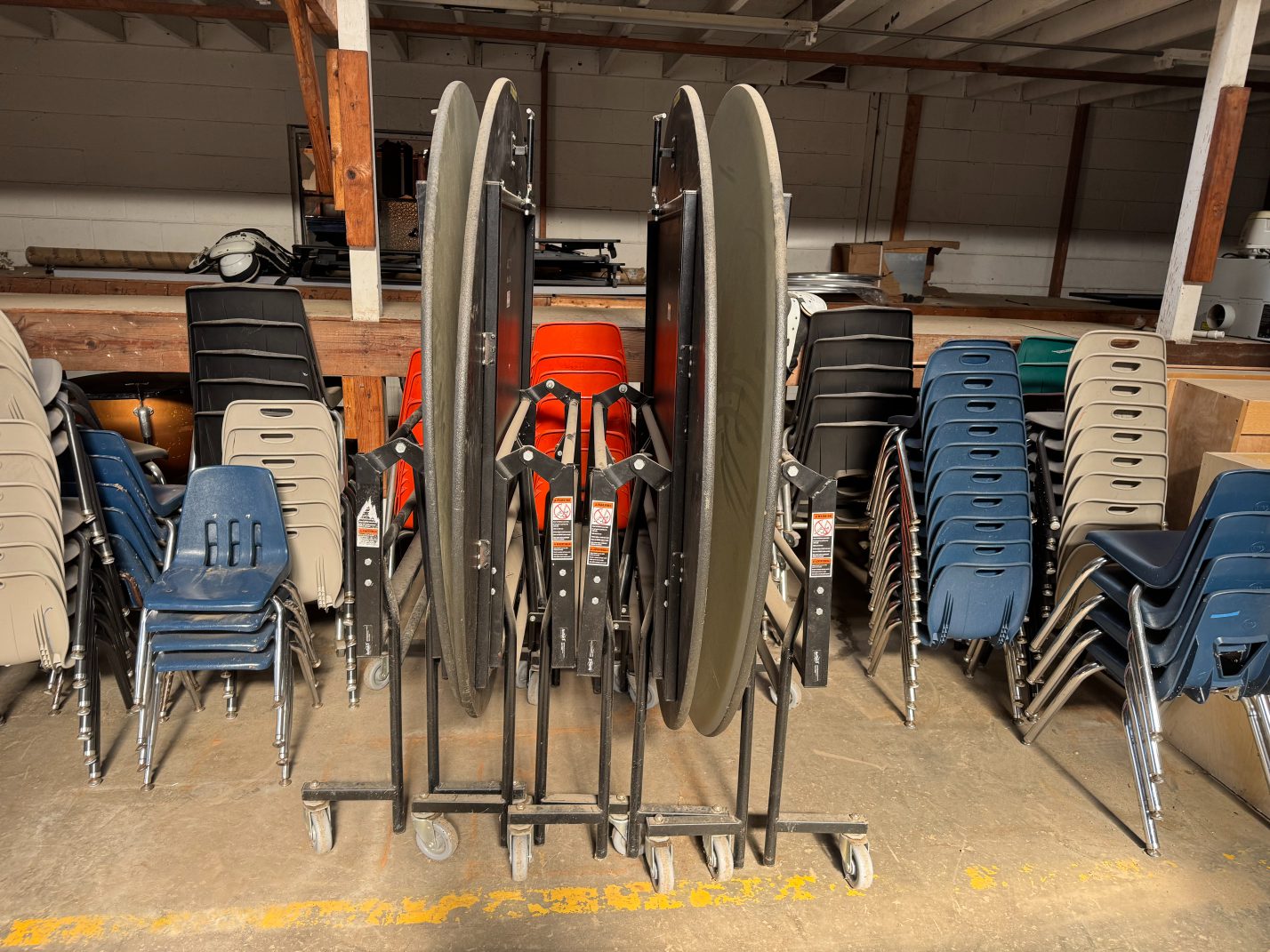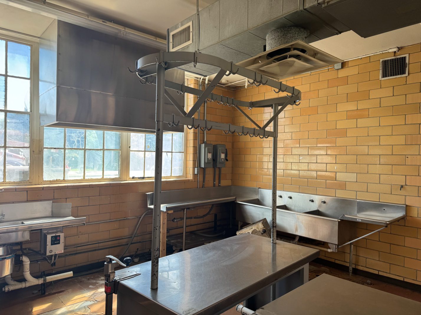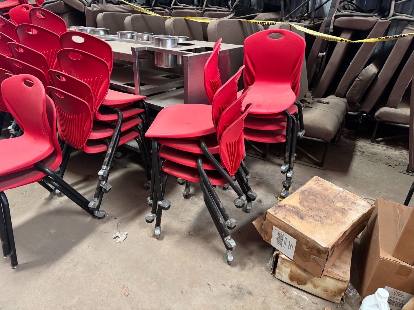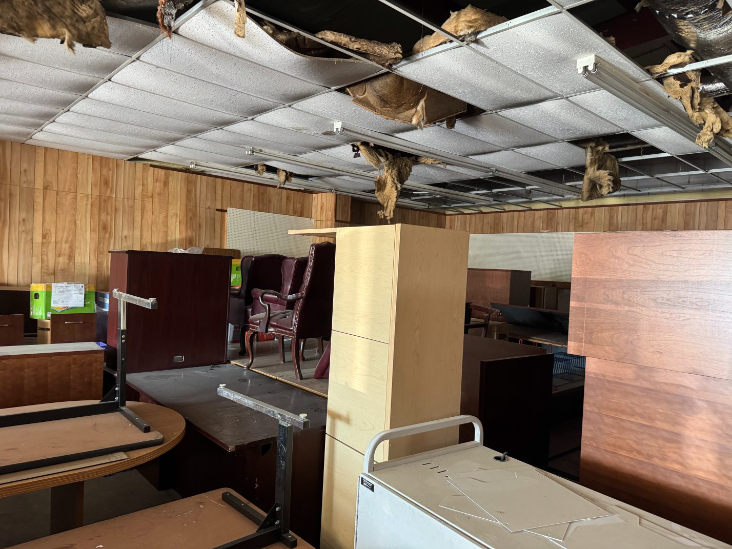 12′ Buffet Bar – True SS 2-Door Refrigerator – (2) USA Range 6-Burner Gas Stoves – 3-Vat SS Sink – SS Dishwashing Table w/Disposal – SS Table w/Pot Rack & Can Opener – SS Tables – Cafeteria Tables – Desks – Chairs – Metal Shelves – Electronics (Computers, Printers, Projectors) – Metal & Rubbermaid Cabinets – File Cabinets – Roll Around Shelves – Portable Stairs – Tables