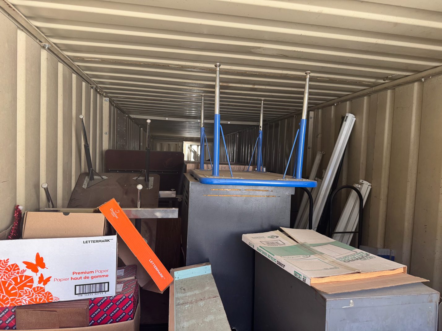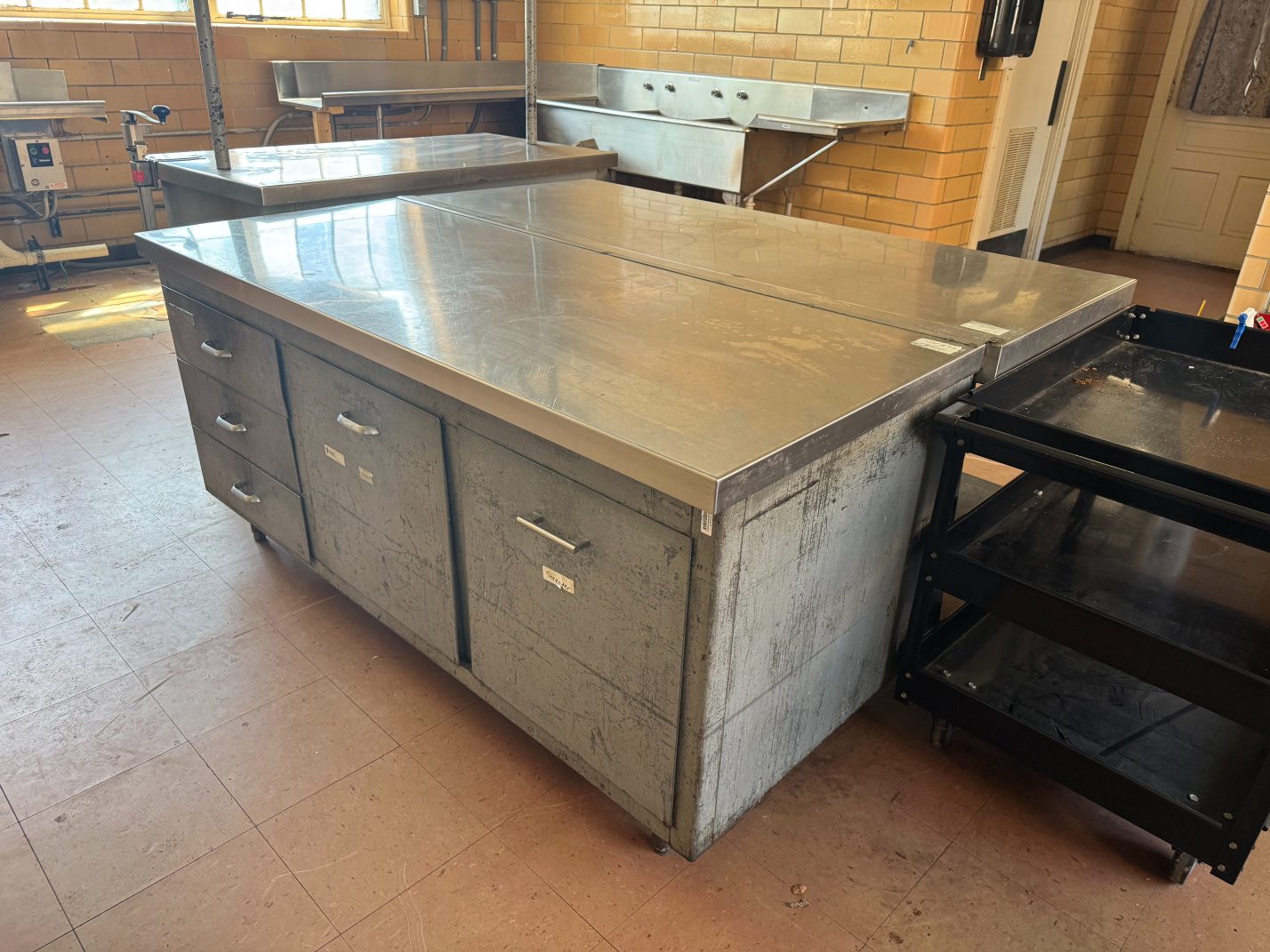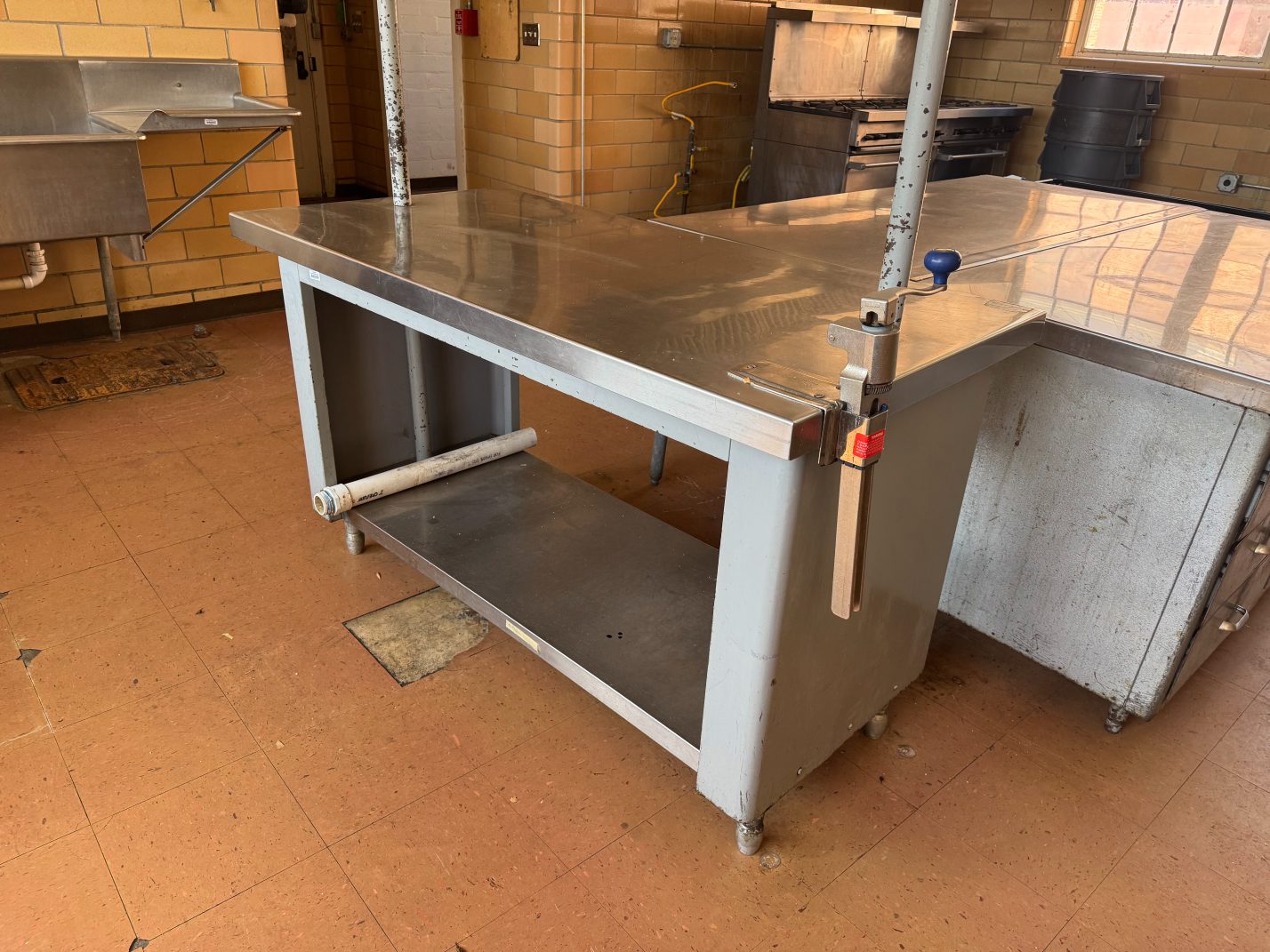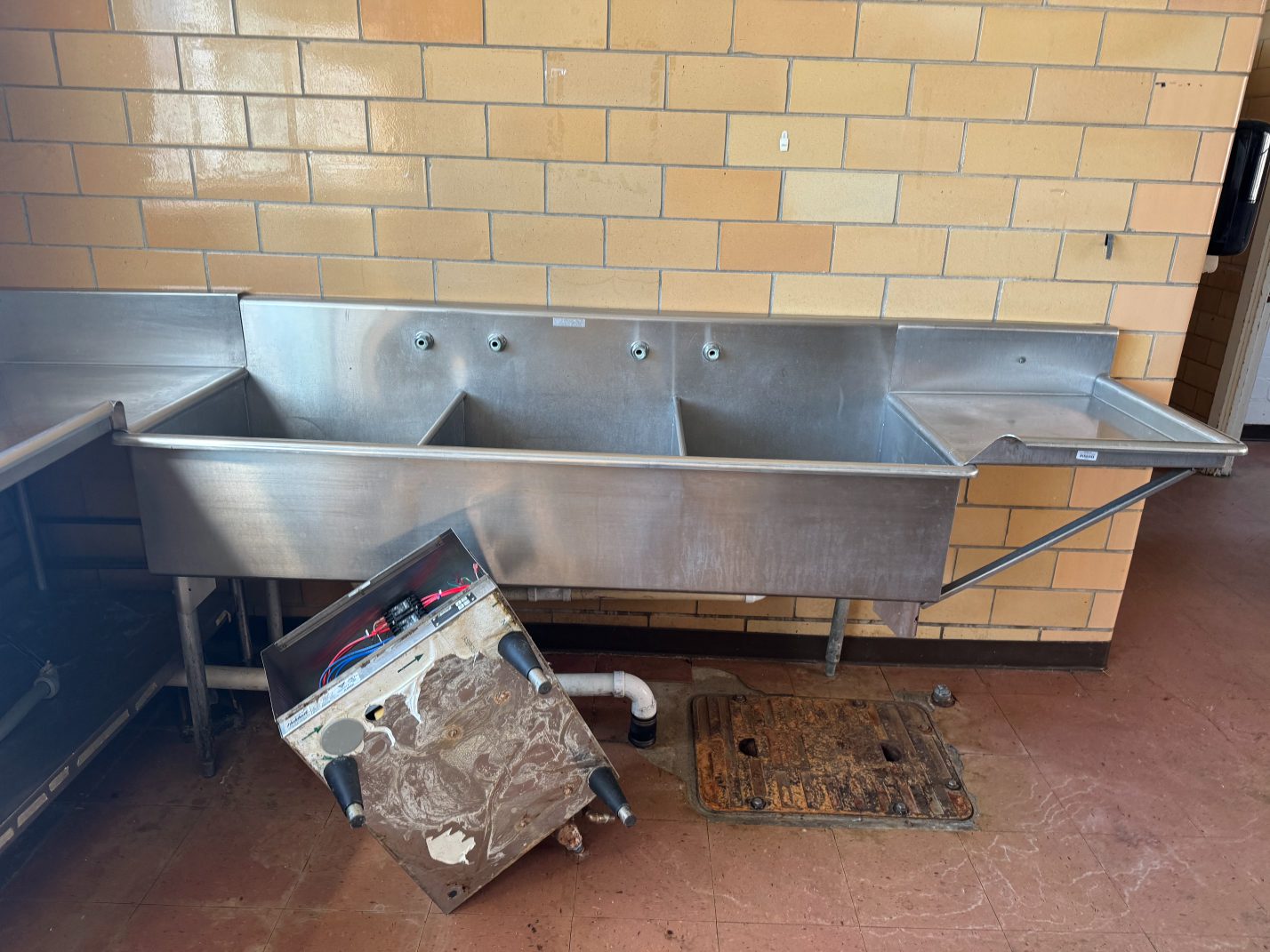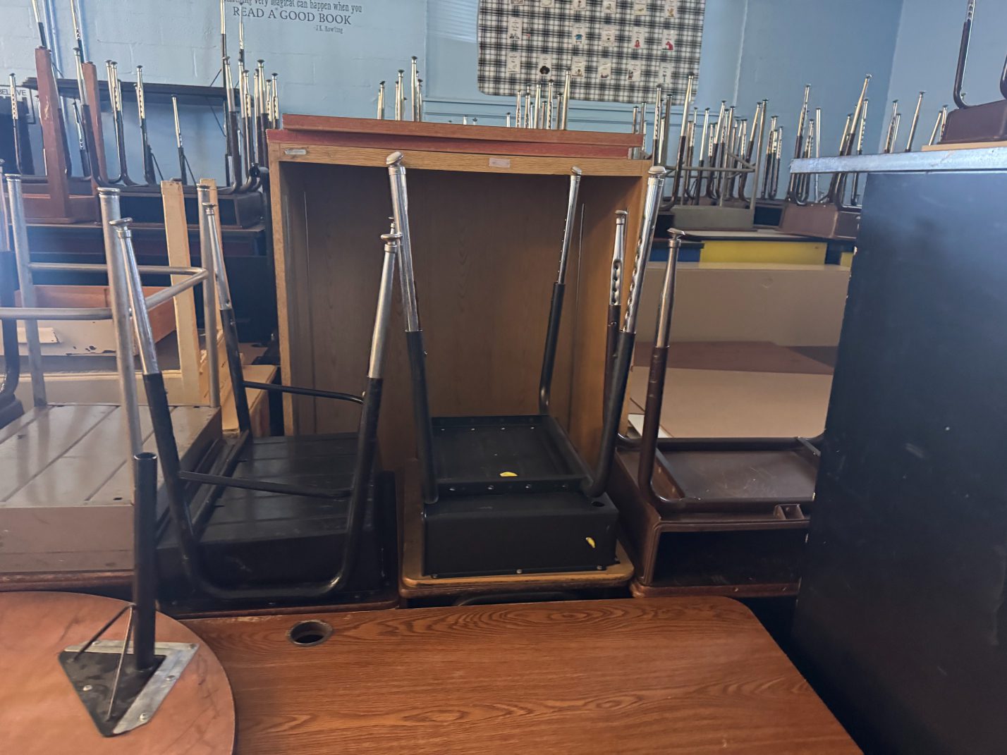 12′ Buffet Bar – True SS 2-Door Refrigerator – (2) USA Range 6-Burner Gas Stoves – 3-Vat SS Sink – SS Dishwashing Table w/Disposal – SS Table w/Pot Rack & Can Opener – SS Tables – Cafeteria Tables – Desks – Chairs – Metal Shelves – Electronics (Computers, Printers, Projectors) – Metal & Rubbermaid Cabinets – File Cabinets – Roll Around Shelves – Portable Stairs – Tables