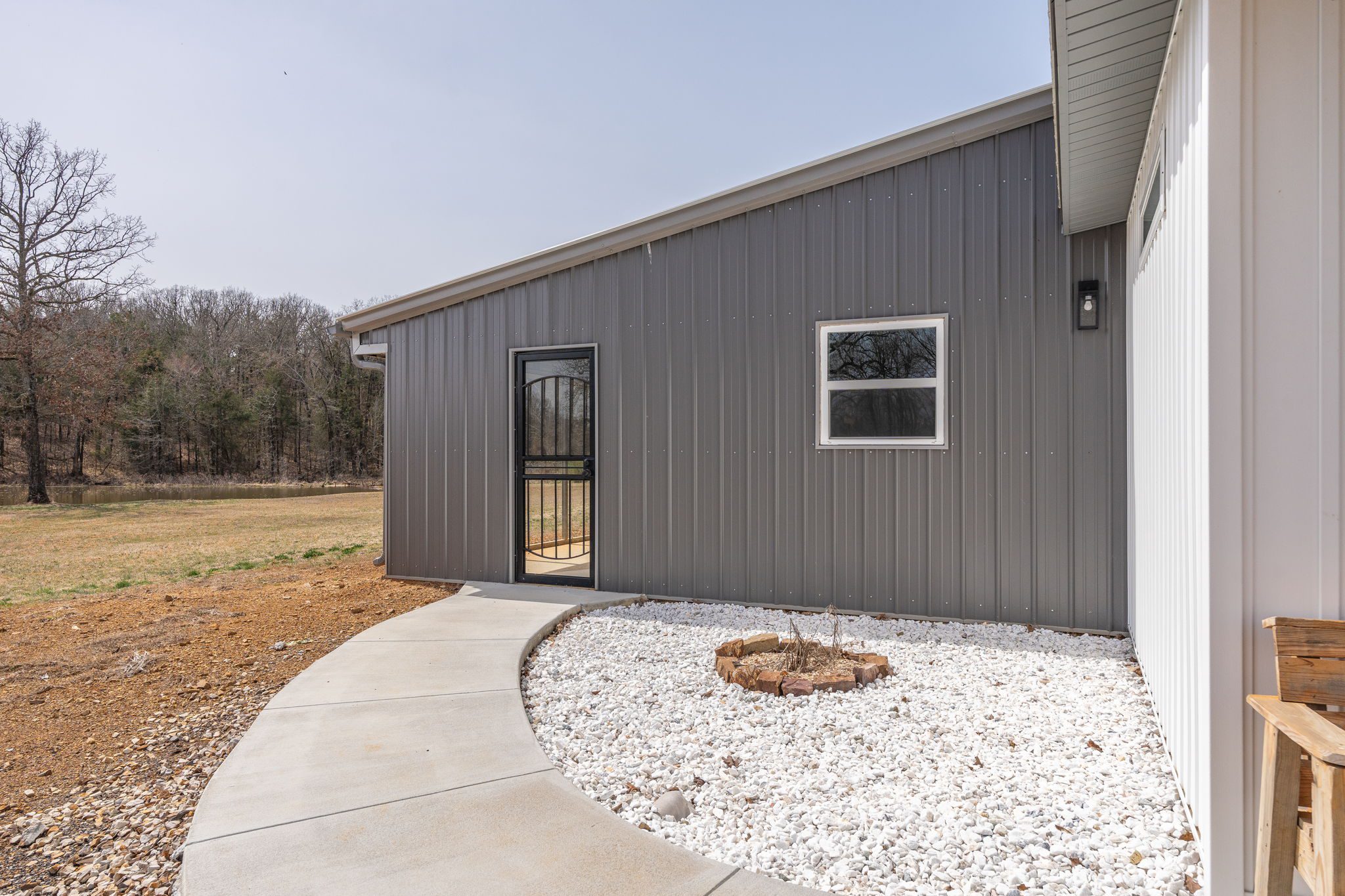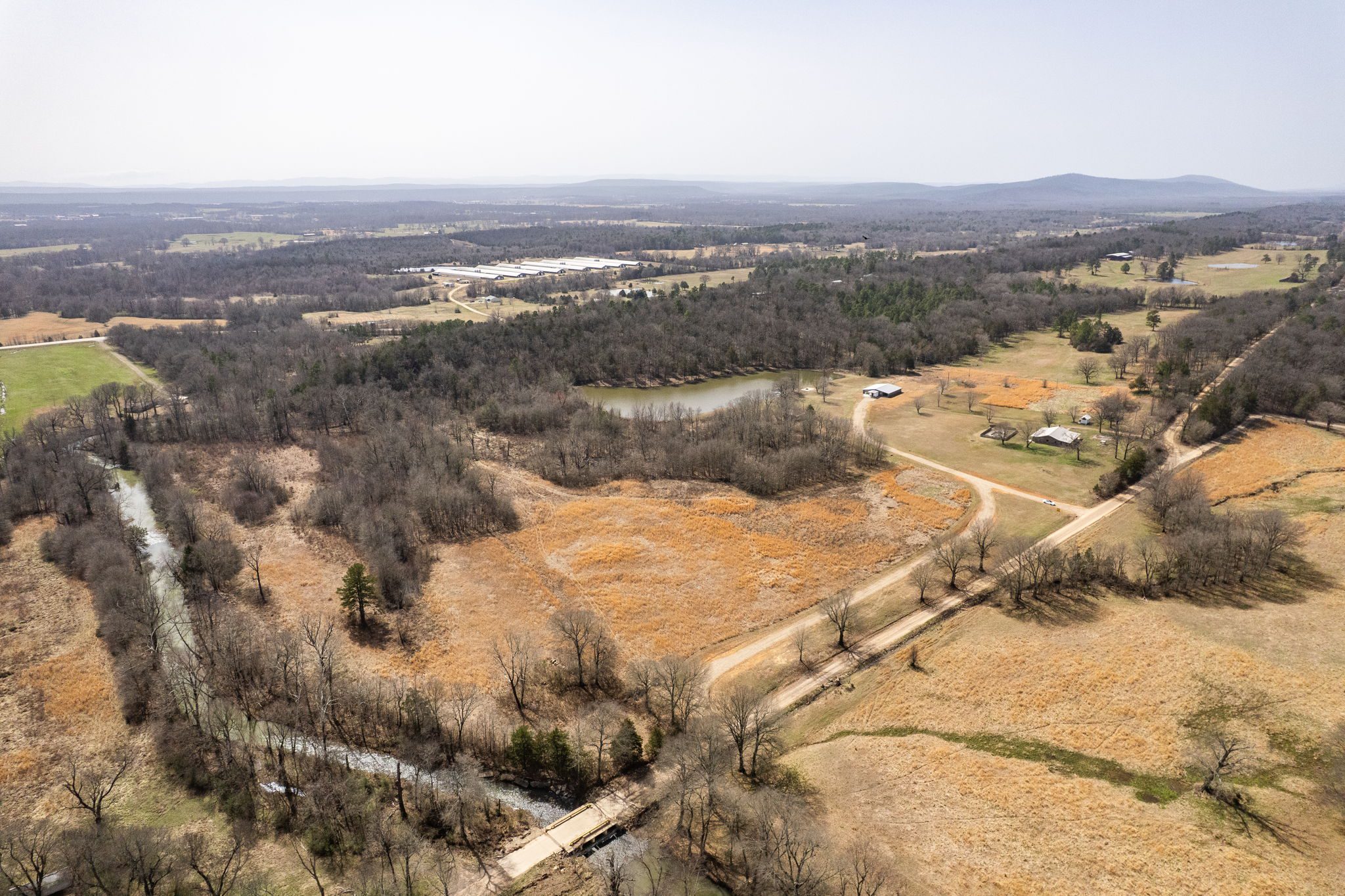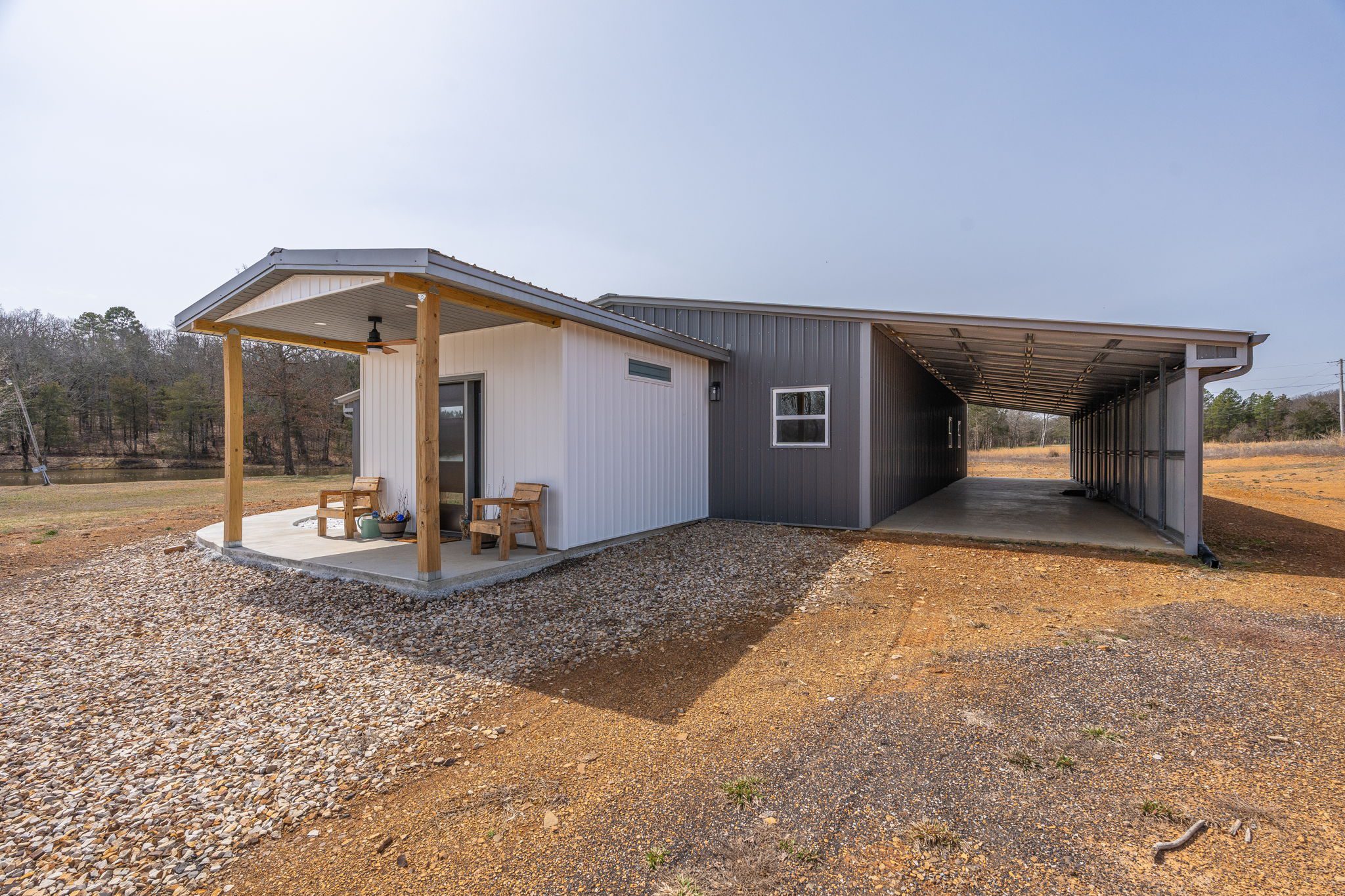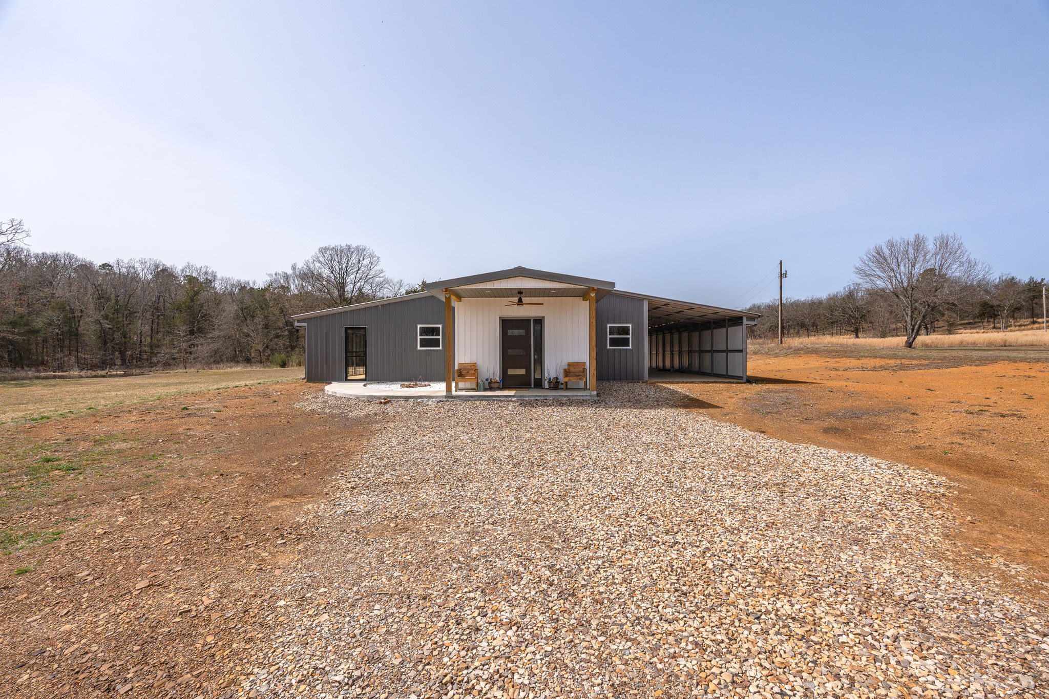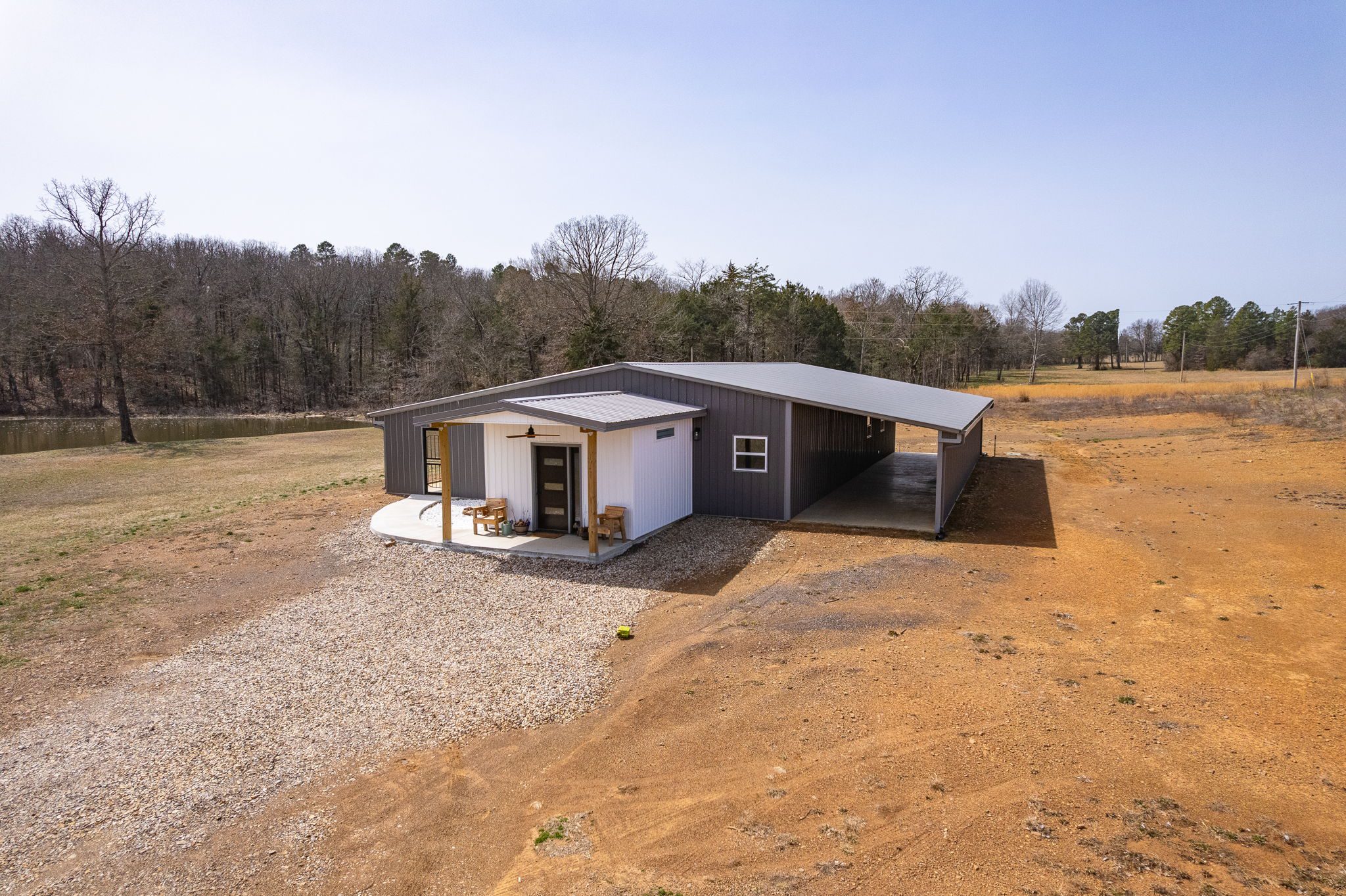 Lovely appx 44-acre retreat or home featuring a beautiful 2,064 sf, 3-bedroom, 1-bath barndominium built in 2023. This stunning property offers the perfect blend of natural beauty and modern living, with a large open kitchen featuring quartz countertops and an expansive open living area perfect for entertaining. The home has luxury plank flooring with high quality carpet in the bedrooms and porcelain tile in the bathroom. The home also includes an approximately 12×50 covered porch for relaxation and an approximately 12×50 enclosed carport for vehicles and storage. The property boasts a 3-acre pond for fishing and recreation, borders a creek offering scenic views and tranquility, and has open land ideal for building, planting, or raising livestock. Additionally, a wooded area with trails provides endless opportunities for hiking and exploration. Perfect for nature lovers seeking tranquility, families looking for space to grow, or investors interested in a unique property with potential for development.