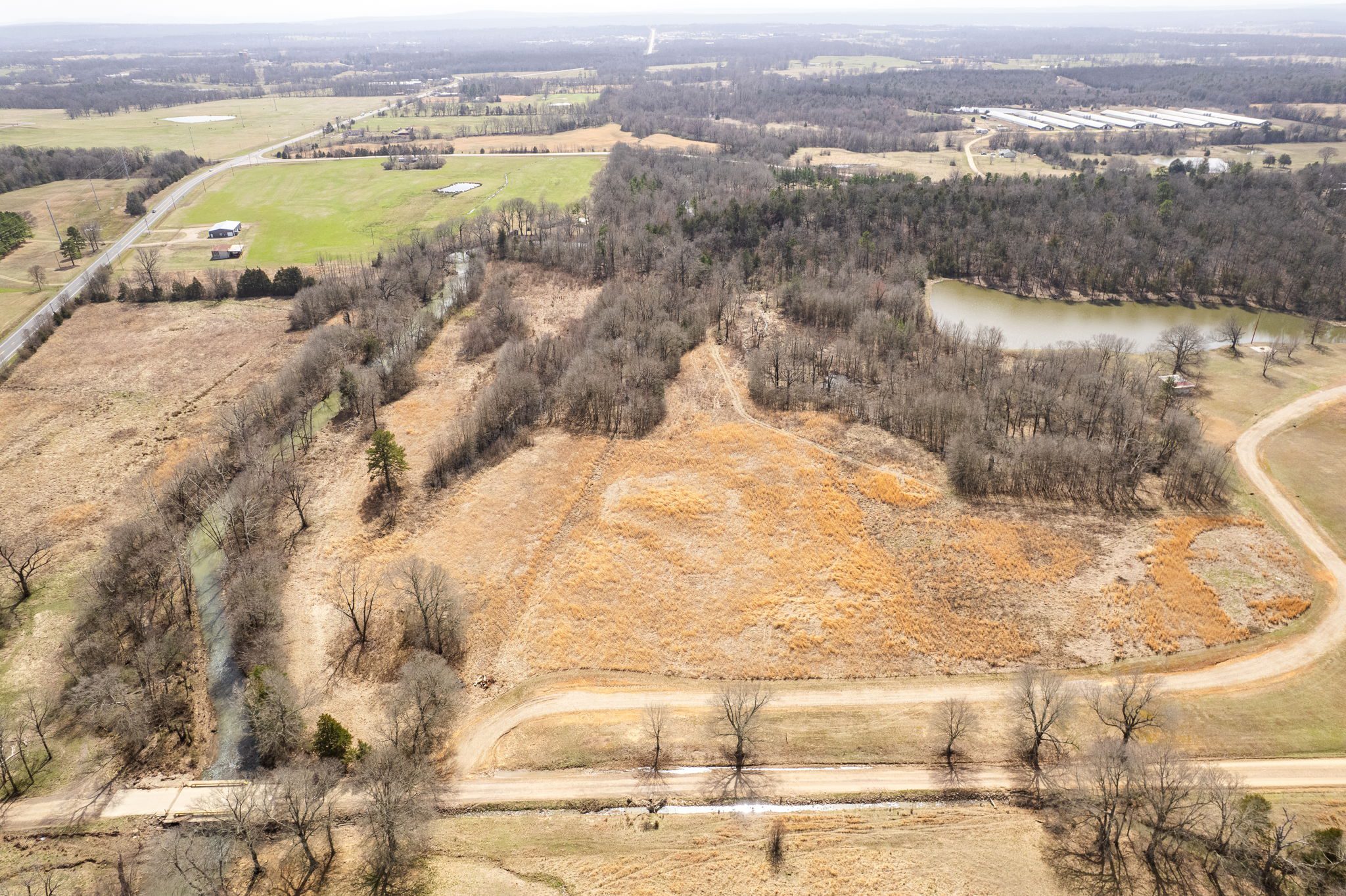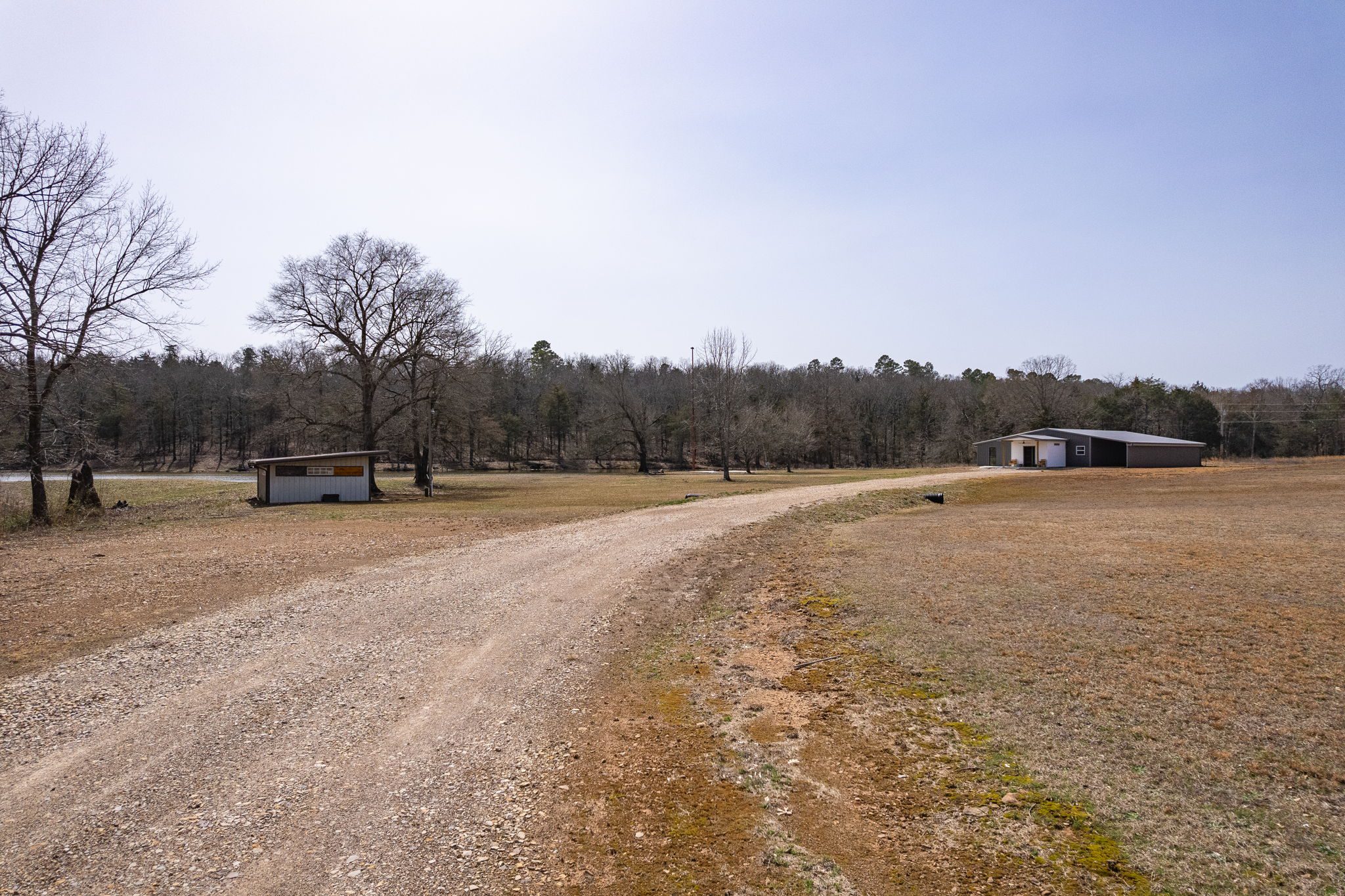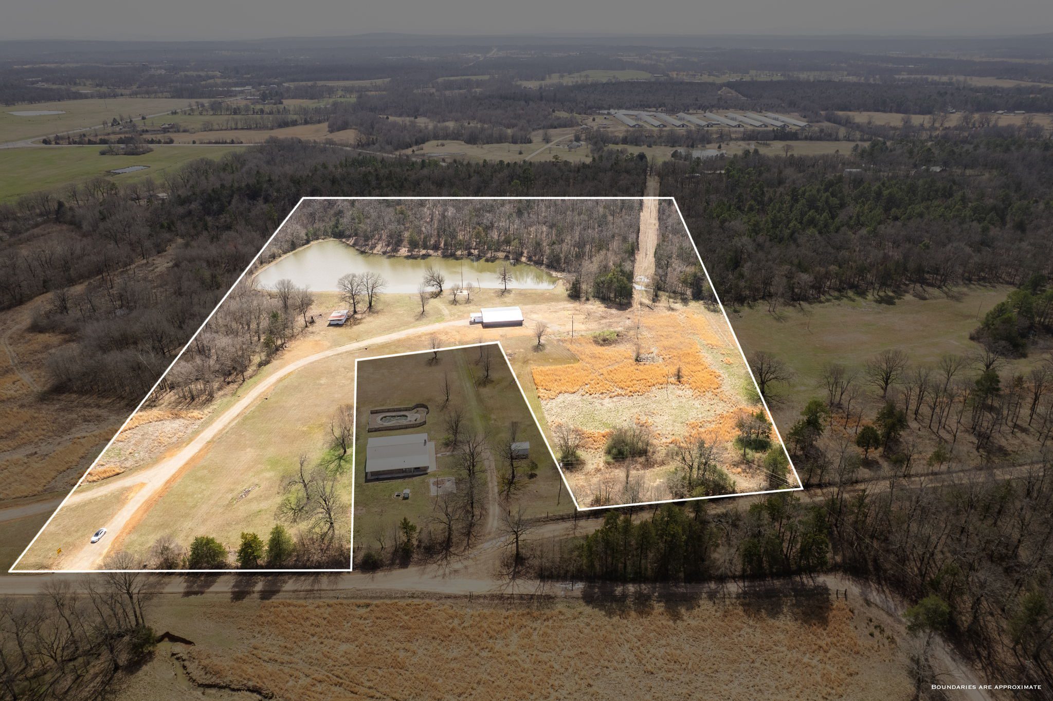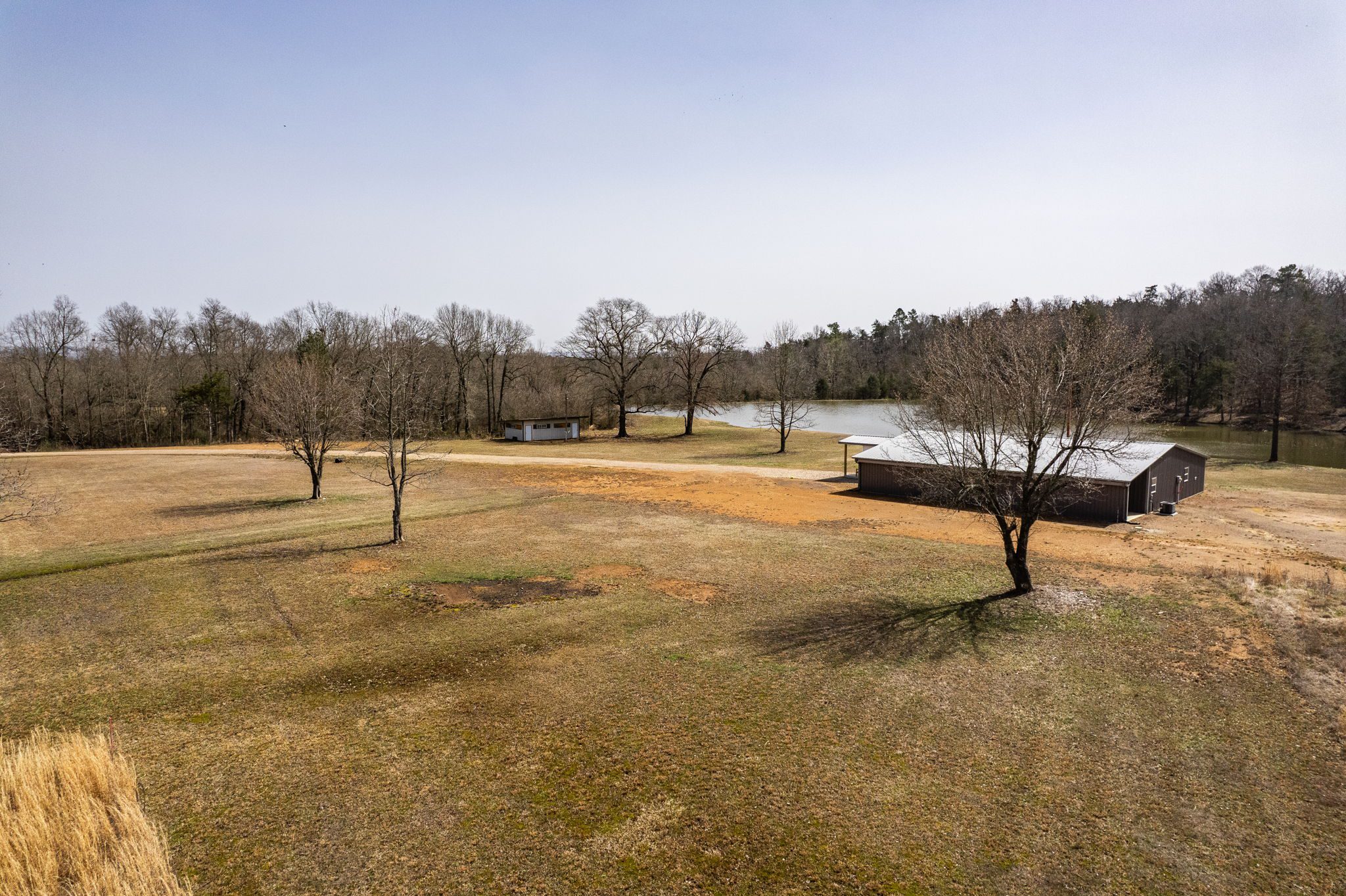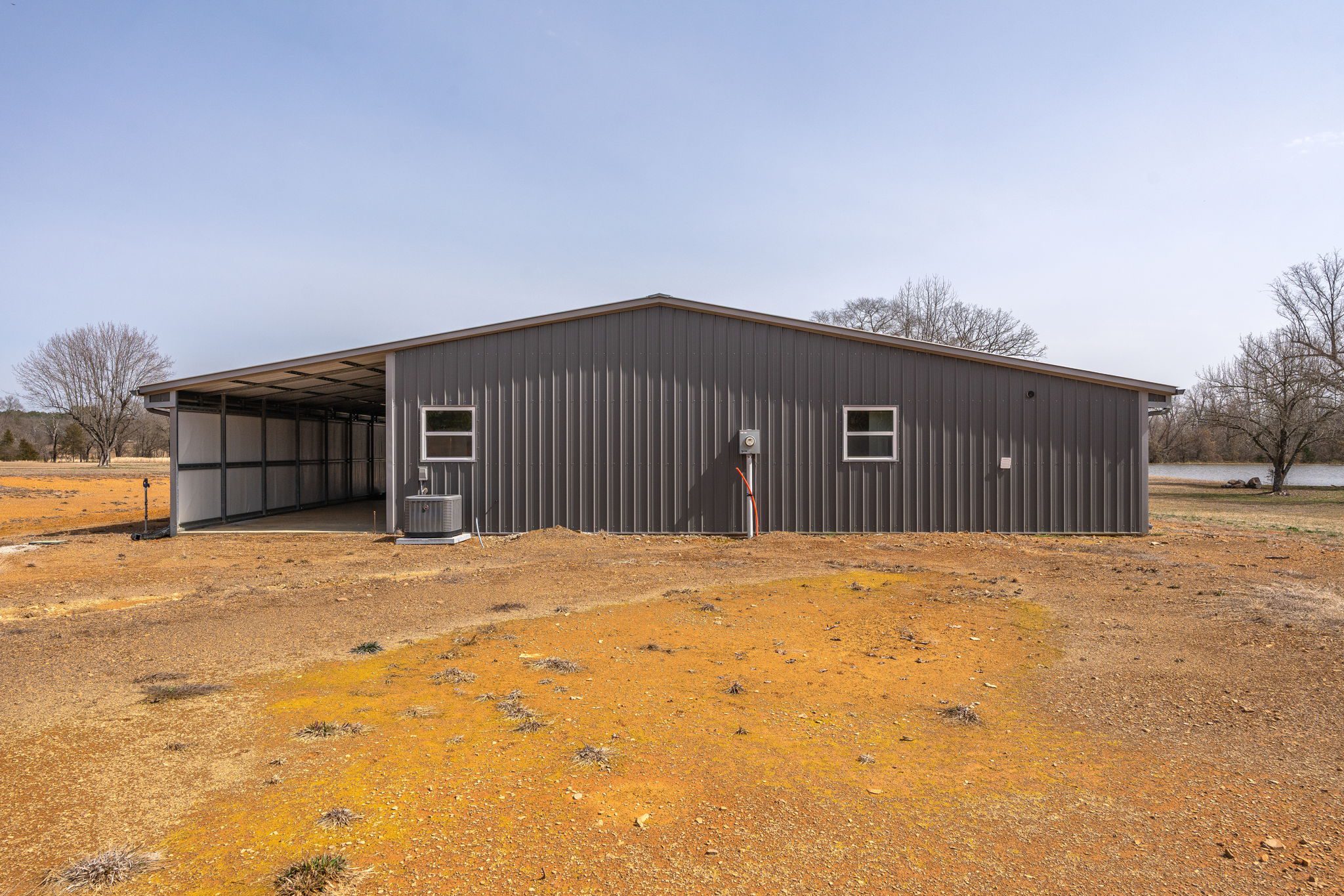 Lovely appx 44-acre retreat or home featuring a beautiful 2,064 sf, 3-bedroom, 1-bath barndominium built in 2023. This stunning property offers the perfect blend of natural beauty and modern living, with a large open kitchen featuring quartz countertops and an expansive open living area perfect for entertaining. The home has luxury plank flooring with high quality carpet in the bedrooms and porcelain tile in the bathroom. The home also includes an approximately 12×50 covered porch for relaxation and an approximately 12×50 enclosed carport for vehicles and storage. The property boasts a 3-acre pond for fishing and recreation, borders a creek offering scenic views and tranquility, and has open land ideal for building, planting, or raising livestock. Additionally, a wooded area with trails provides endless opportunities for hiking and exploration. Perfect for nature lovers seeking tranquility, families looking for space to grow, or investors interested in a unique property with potential for development.