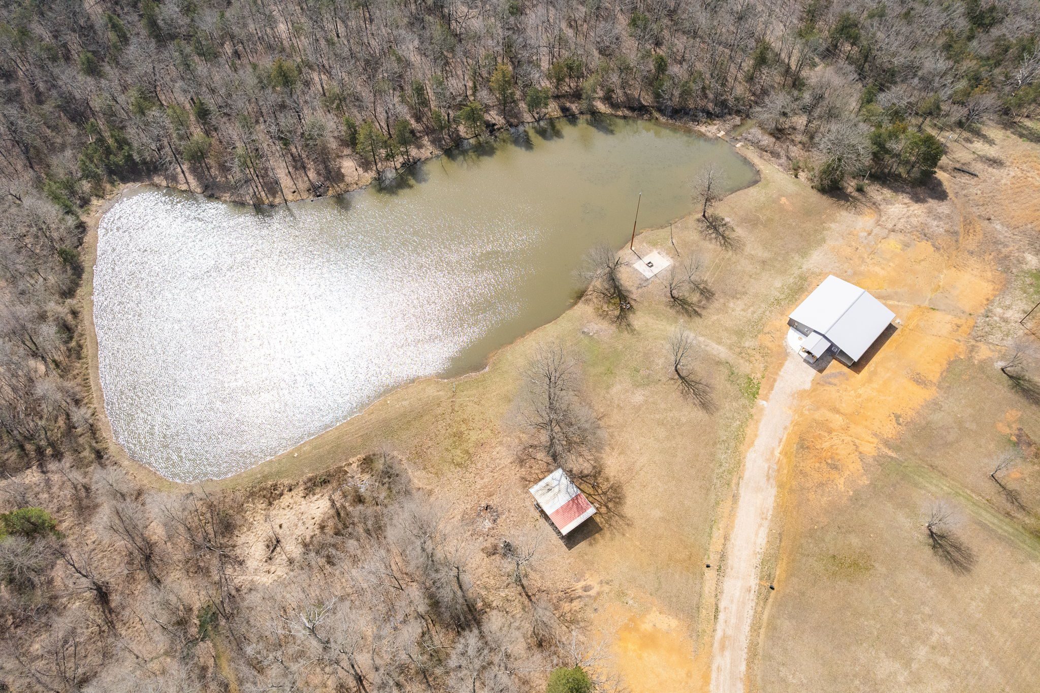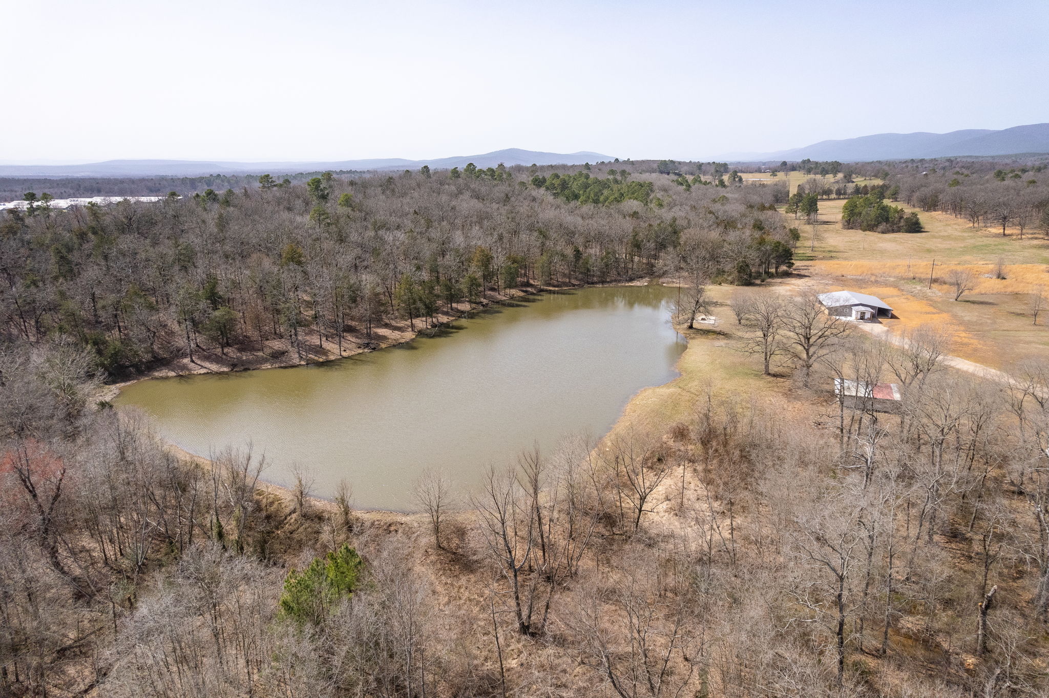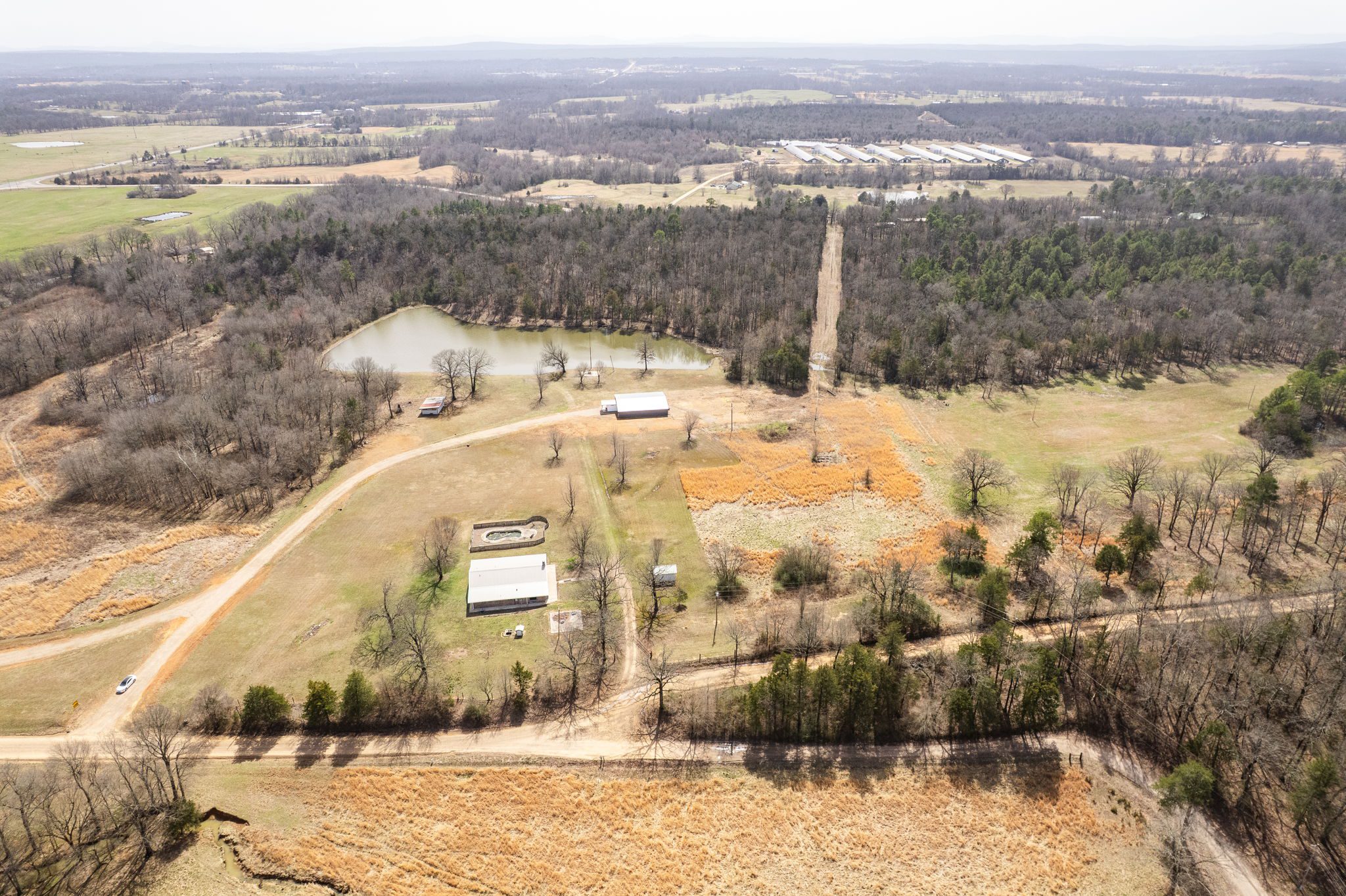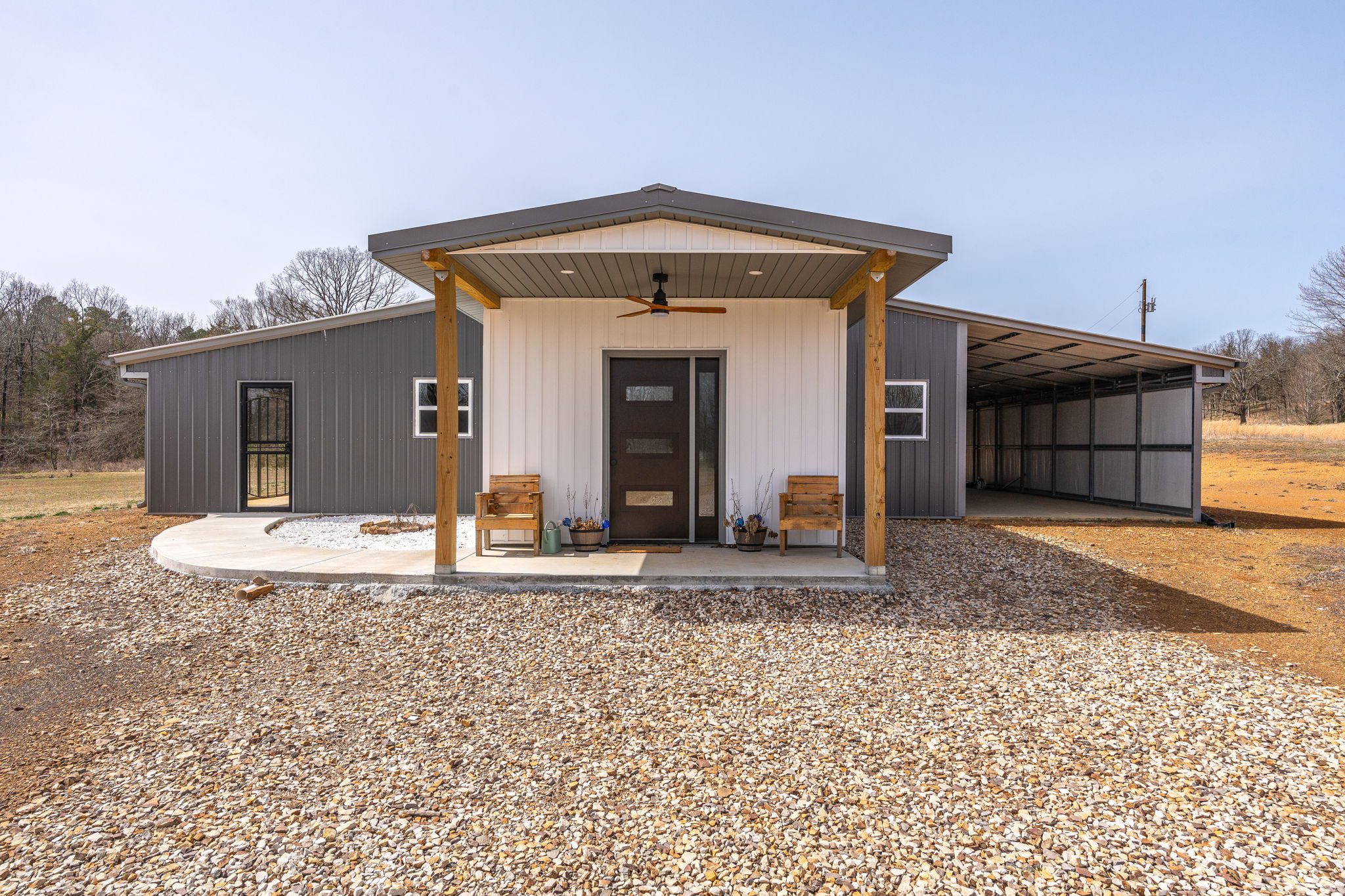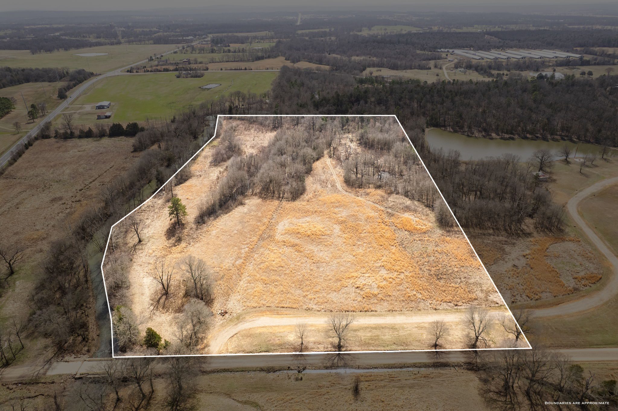 Lovely appx 44-acre retreat or home featuring a beautiful 2,064 sf, 3-bedroom, 1-bath barndominium built in 2023. This stunning property offers the perfect blend of natural beauty and modern living, with a large open kitchen featuring quartz countertops and an expansive open living area perfect for entertaining. The home has luxury plank flooring with high quality carpet in the bedrooms and porcelain tile in the bathroom. The home also includes an approximately 12×50 covered porch for relaxation and an approximately 12×50 enclosed carport for vehicles and storage. The property boasts a 3-acre pond for fishing and recreation, borders a creek offering scenic views and tranquility, and has open land ideal for building, planting, or raising livestock. Additionally, a wooded area with trails provides endless opportunities for hiking and exploration. Perfect for nature lovers seeking tranquility, families looking for space to grow, or investors interested in a unique property with potential for development.