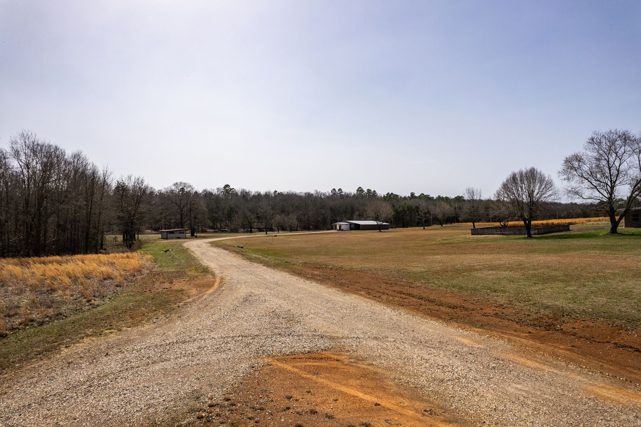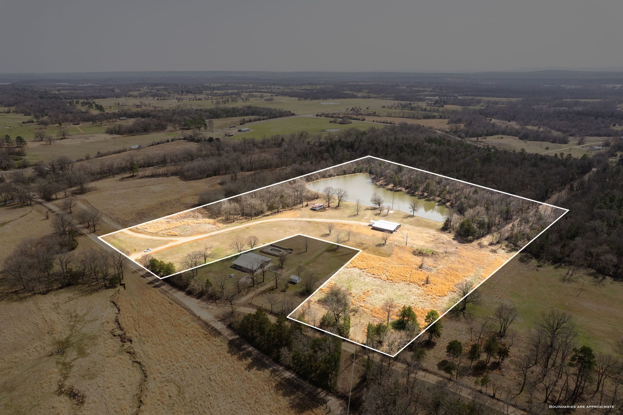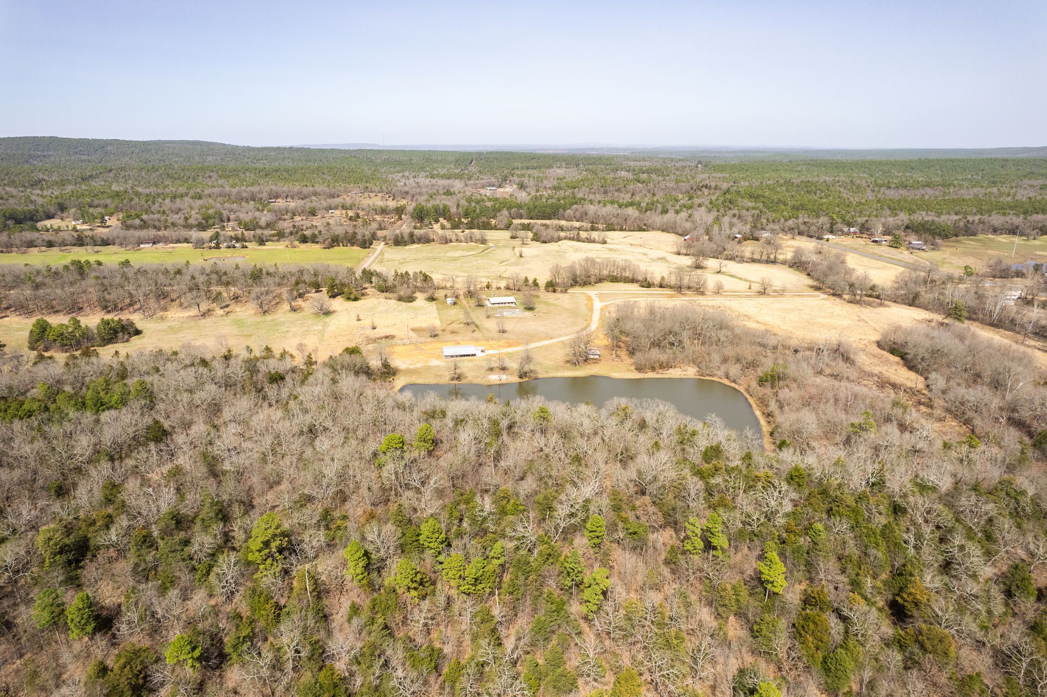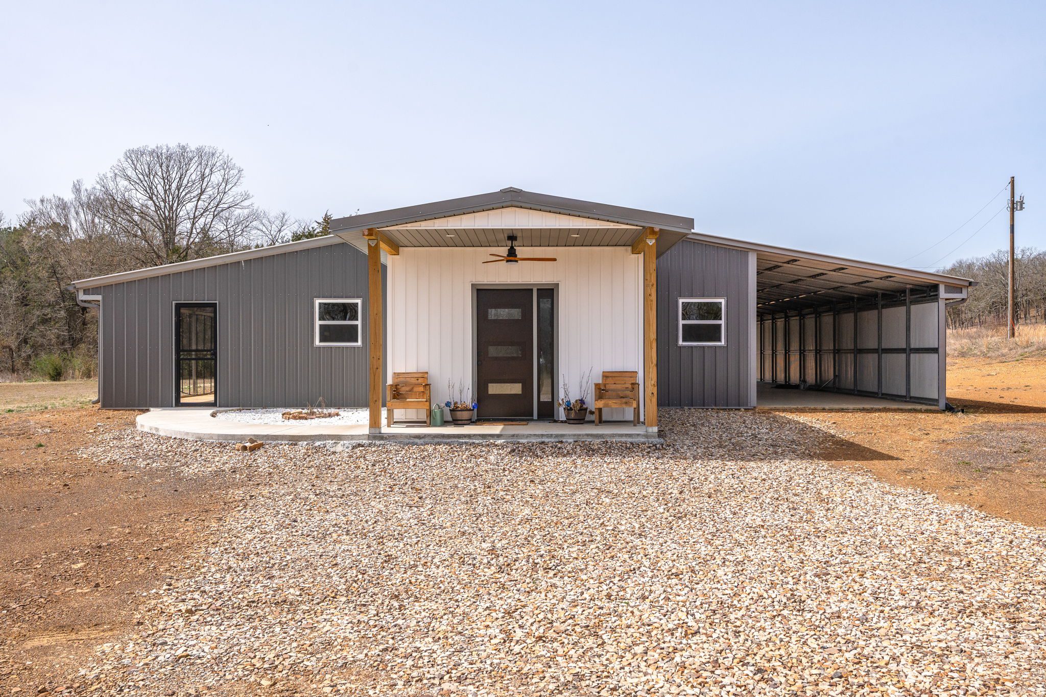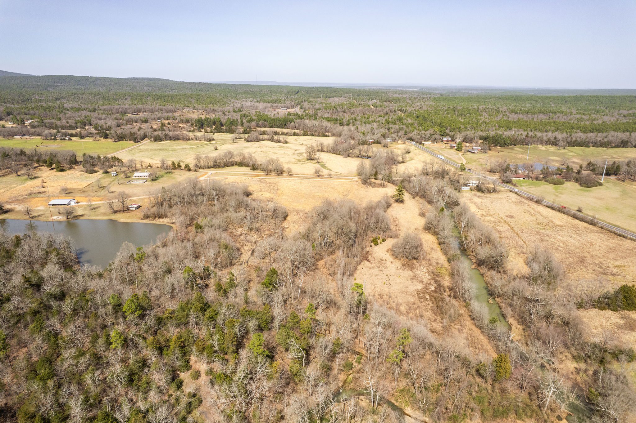 Lovely appx 44-acre retreat or home featuring a beautiful 2,064 sf, 3-bedroom, 1-bath barndominium built in 2023. This stunning property offers the perfect blend of natural beauty and modern living, with a large open kitchen featuring quartz countertops and an expansive open living area perfect for entertaining. The home has luxury plank flooring with high quality carpet in the bedrooms and porcelain tile in the bathroom. The home also includes an approximately 12×50 covered porch for relaxation and an approximately 12×50 enclosed carport for vehicles and storage. The property boasts a 3-acre pond for fishing and recreation, borders a creek offering scenic views and tranquility, and has open land ideal for building, planting, or raising livestock. Additionally, a wooded area with trails provides endless opportunities for hiking and exploration. Perfect for nature lovers seeking tranquility, families looking for space to grow, or investors interested in a unique property with potential for development.