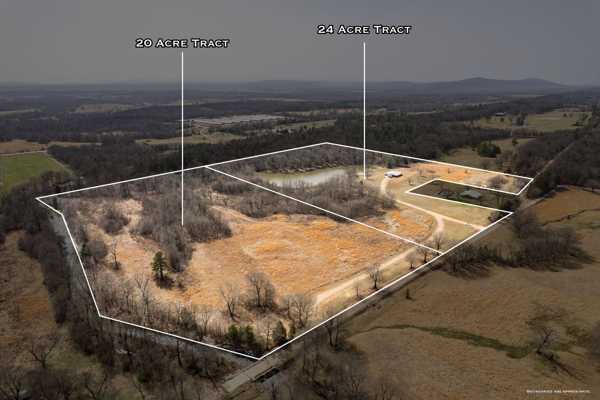 Property will be offered in two tracts: Tract 1: Home, outbuilding & 3-acre pond on appx 24 acres. Tract 2: Appx 20 acres with lots of road frontage and borders the creek.