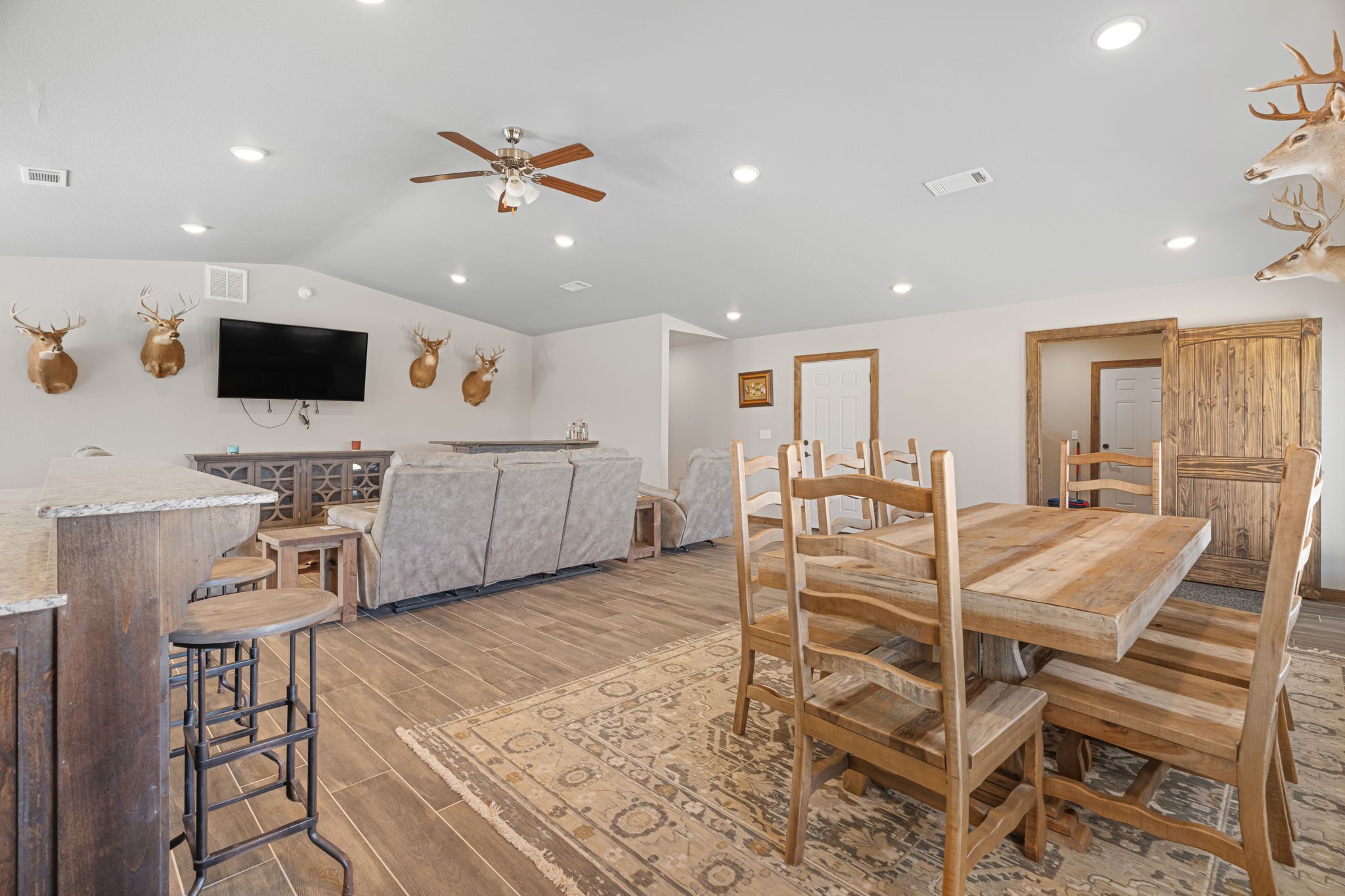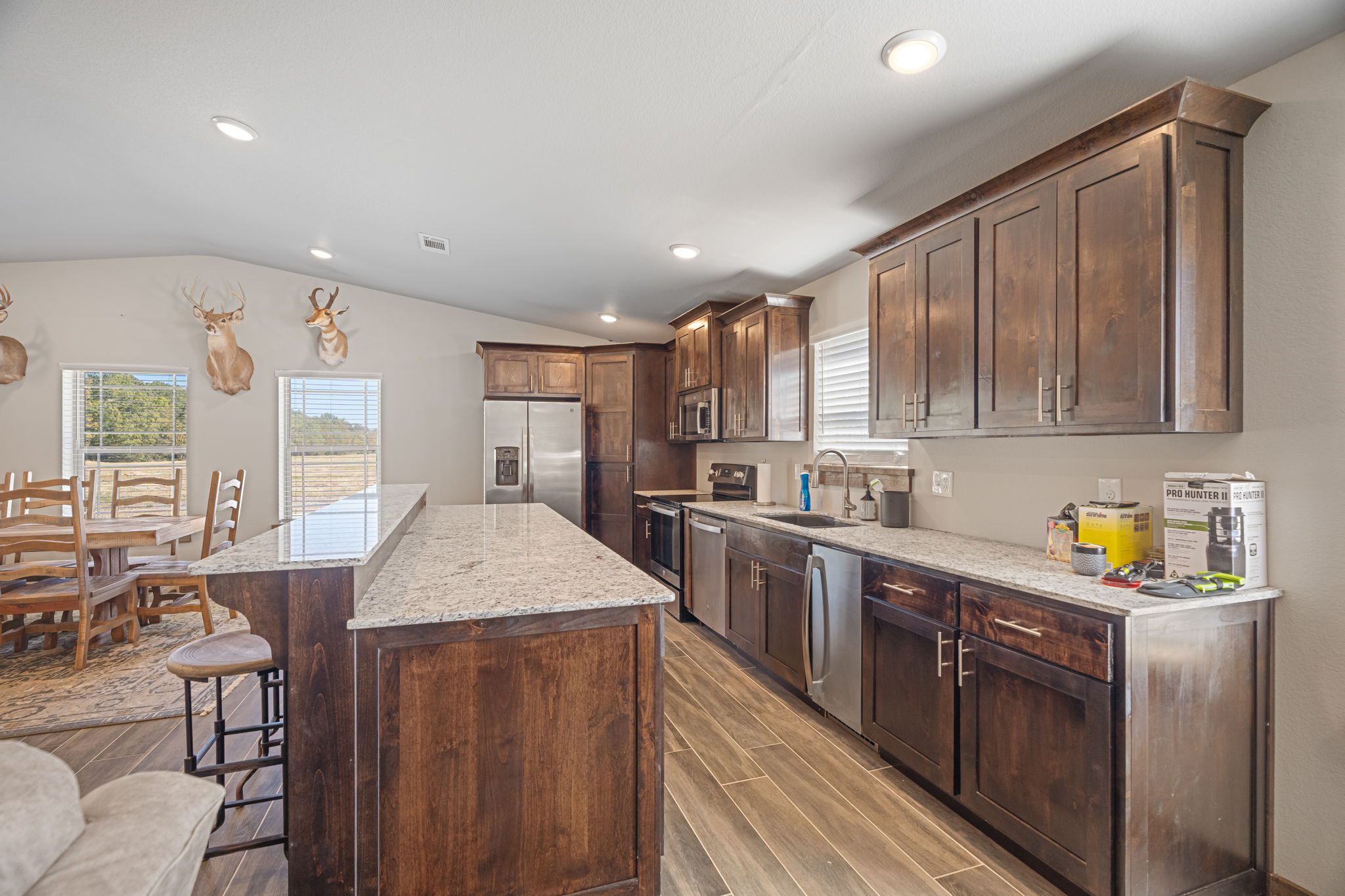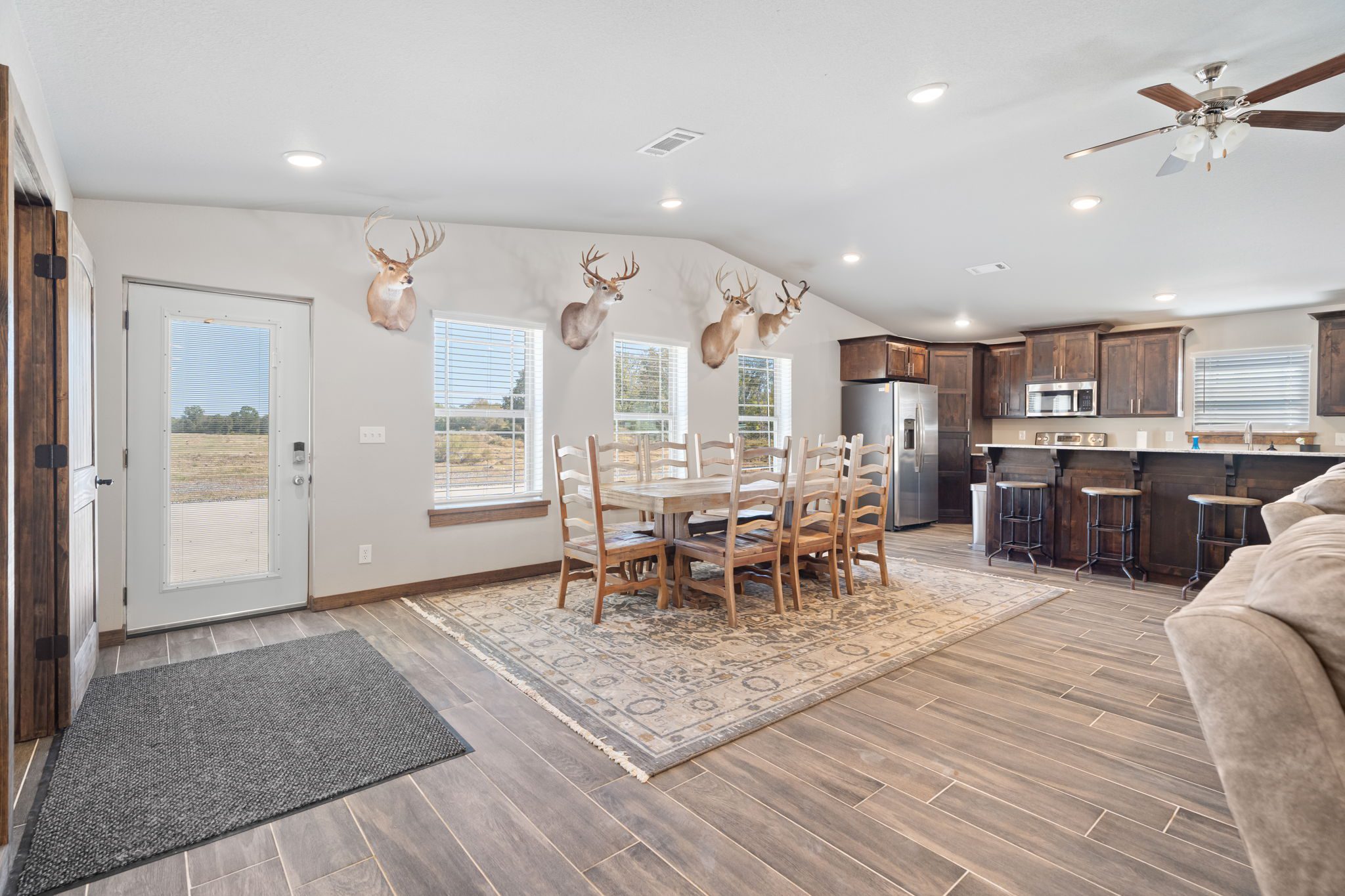 Located at 26971 School House Loop, this stunning property boasts ~312 acres of prime land and a newly constructed barndominium. The living space spans ~1,460 sq ft, featuring 2 oversized bedrooms and 1 spacious bathroom with a large walk-in shower and utility room. The property also includes an impressive ~3,000 sq ft of shop space, complete with two 12′ automatic bay doors and 22′ ceilings, offering plenty of storage.