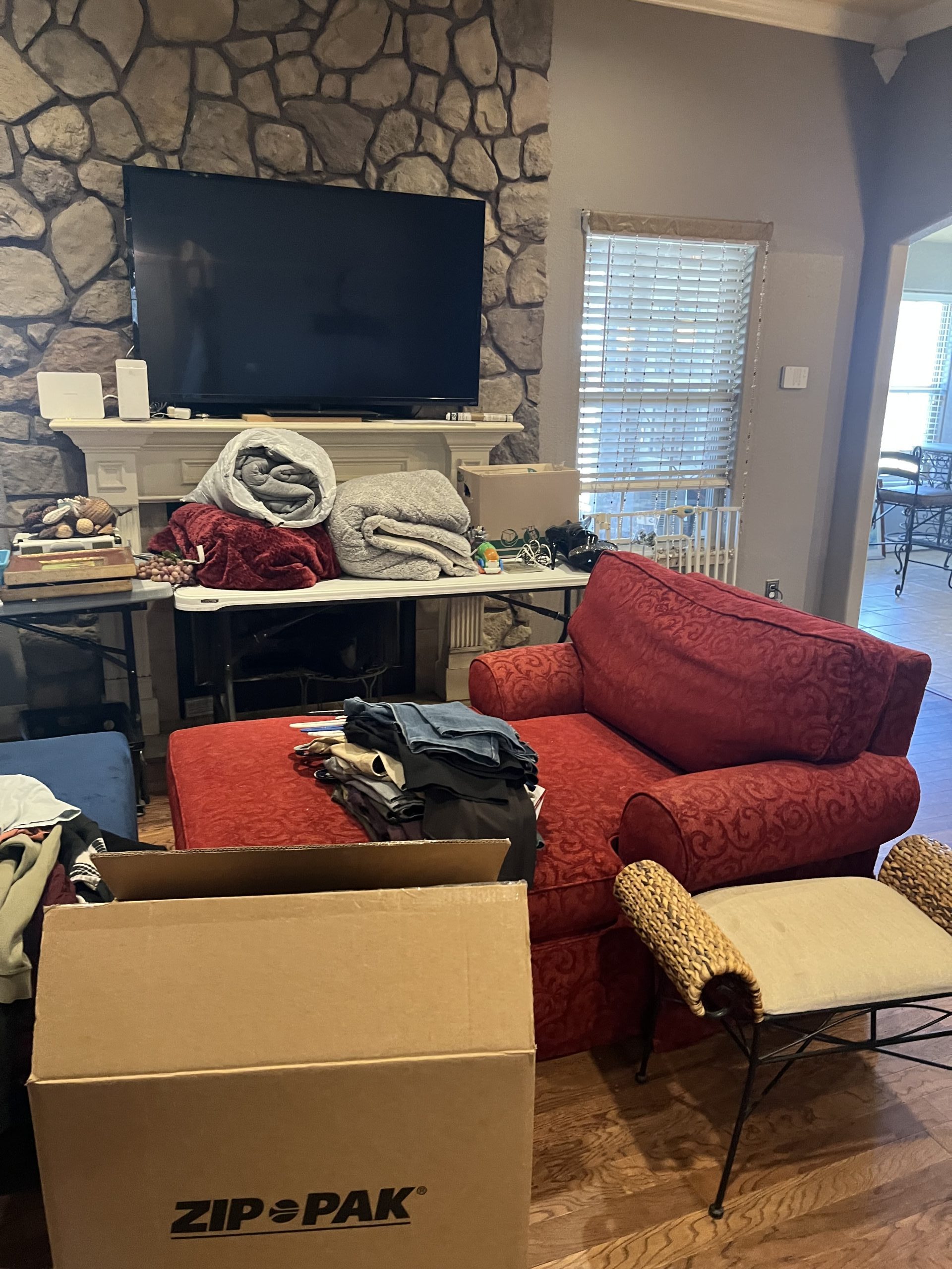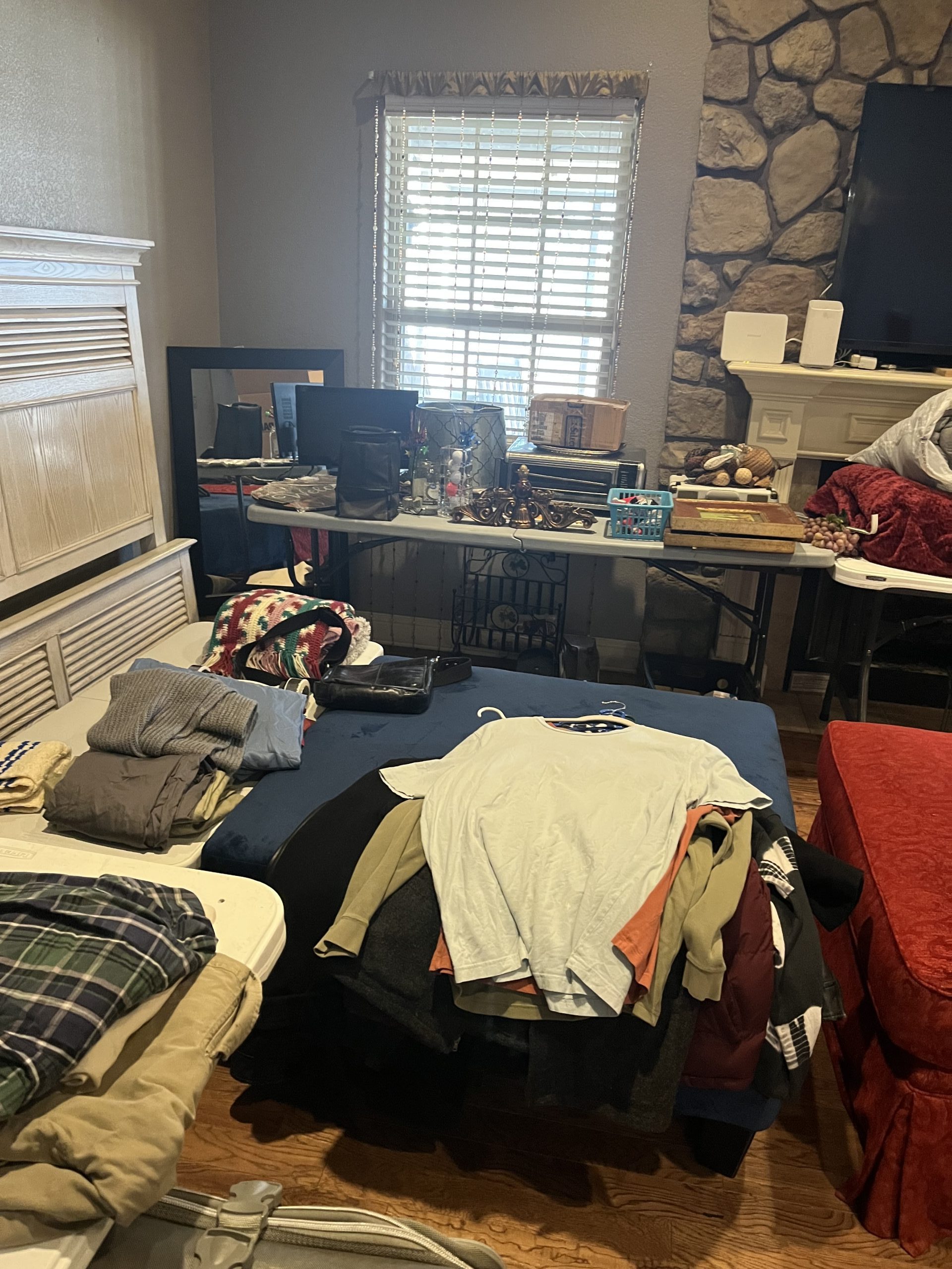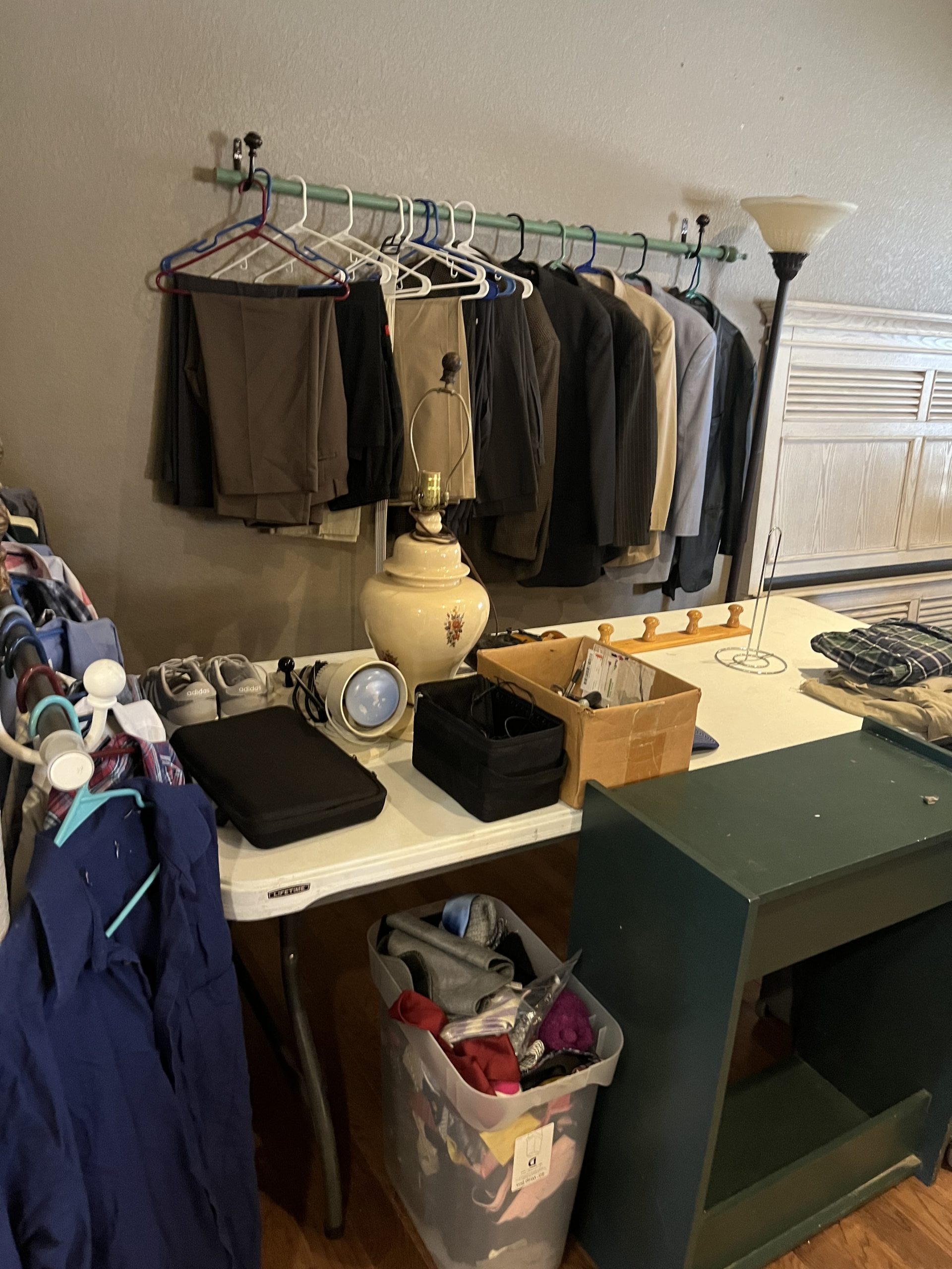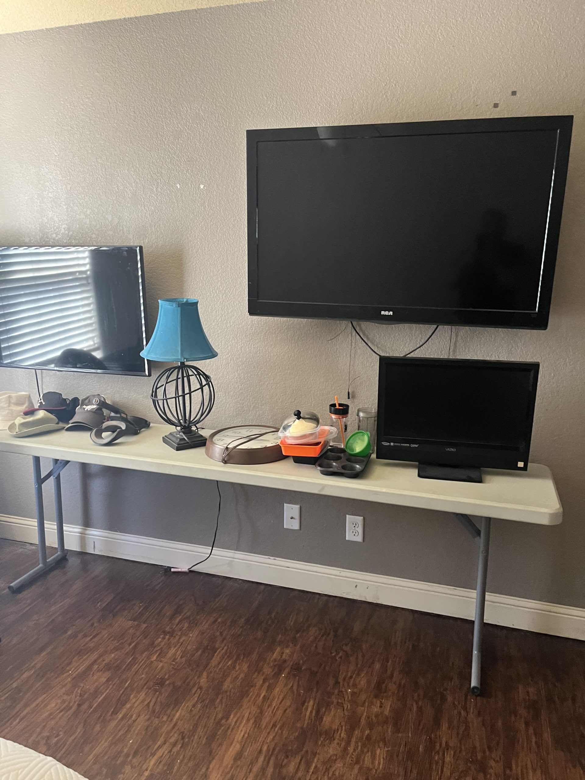 Household Items: Pictures – Neon Beer Sign – Clothing – TVs – Railroad Dolly – Wine Rack